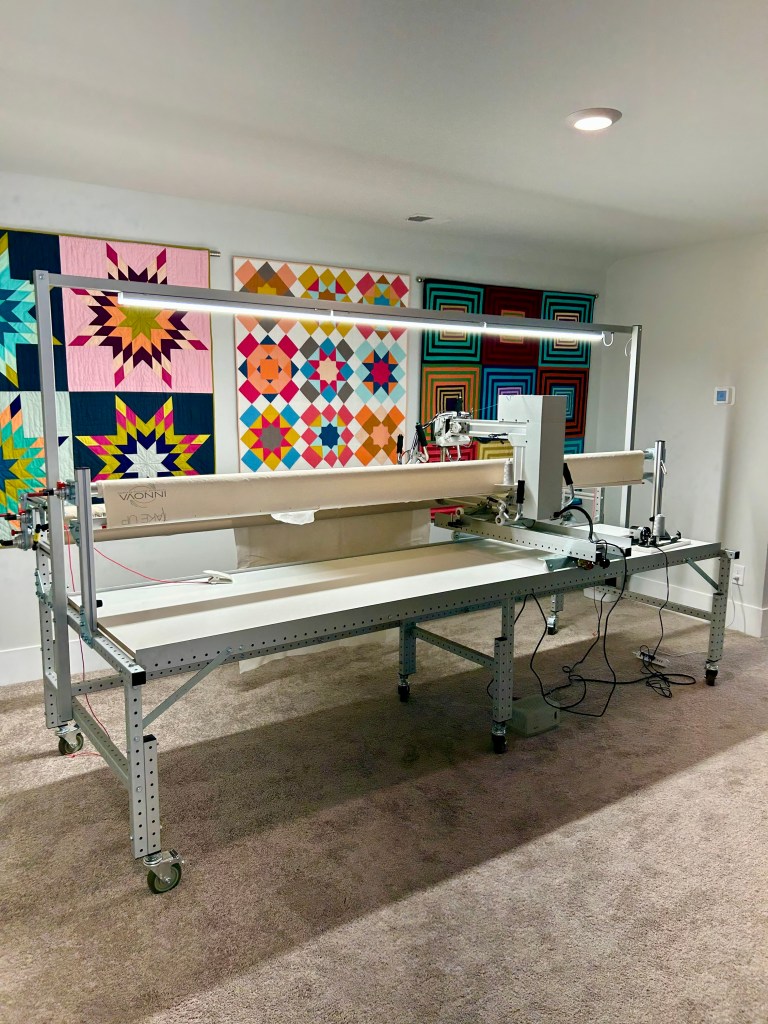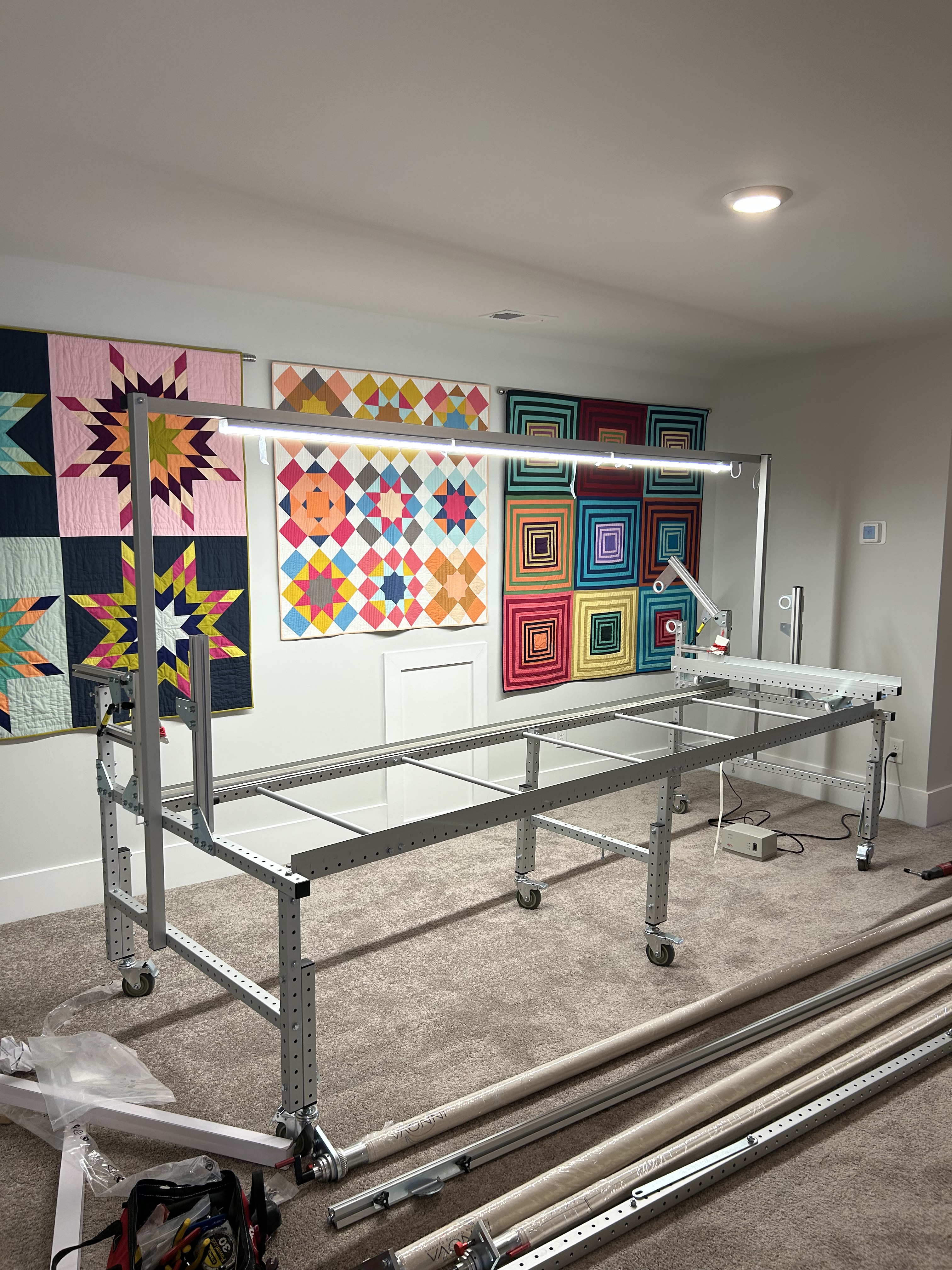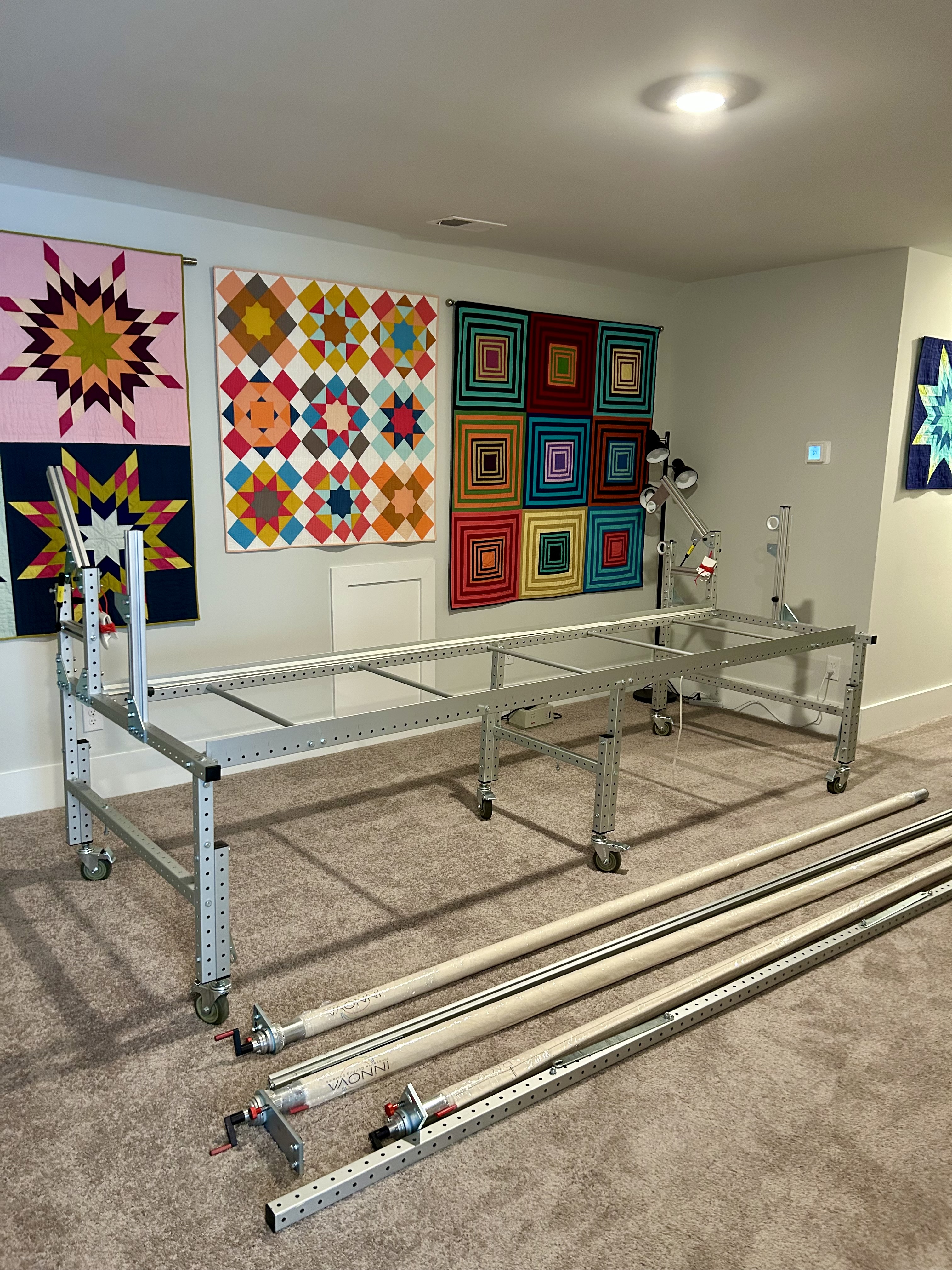 Next, the table pieces get inserted. Note that Innova’s front faces the wall quilts–and we put her on a slight angle so I will have plenty of room to walk around the machine, to load quilts, and to quilt from the front. Having the back facing the room is awesome because I can easily trim quilts on the machine’s back counter. Innova is in a permanent position now; I won’t have to move her.