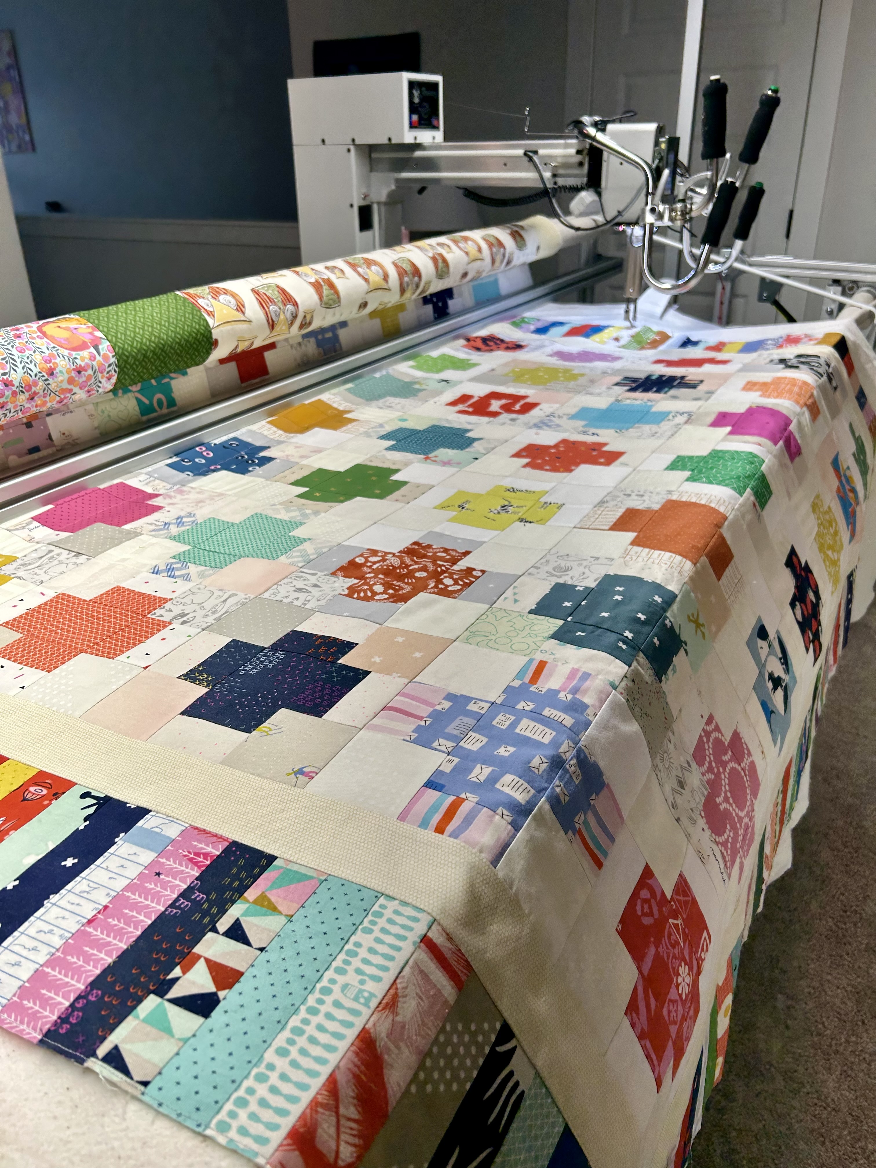 And I spent late yesterday and into the evening setting up and basting the first quilt to be quilted on Innova in South Carolina. It is one of three final quilts of the Cotton+Steel project of these last two years–three if we count these last three quilts. Oh wait! there are the blocks I made back in Maine from the small squares leftover from other C+S projects that I pieced together while waiting for the house to sell.