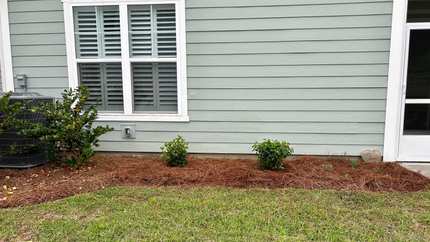 Everyone’s sodded grass is the promised apple green color now, but it now needs help to grow and spread. Here’s a view from the back of my house.