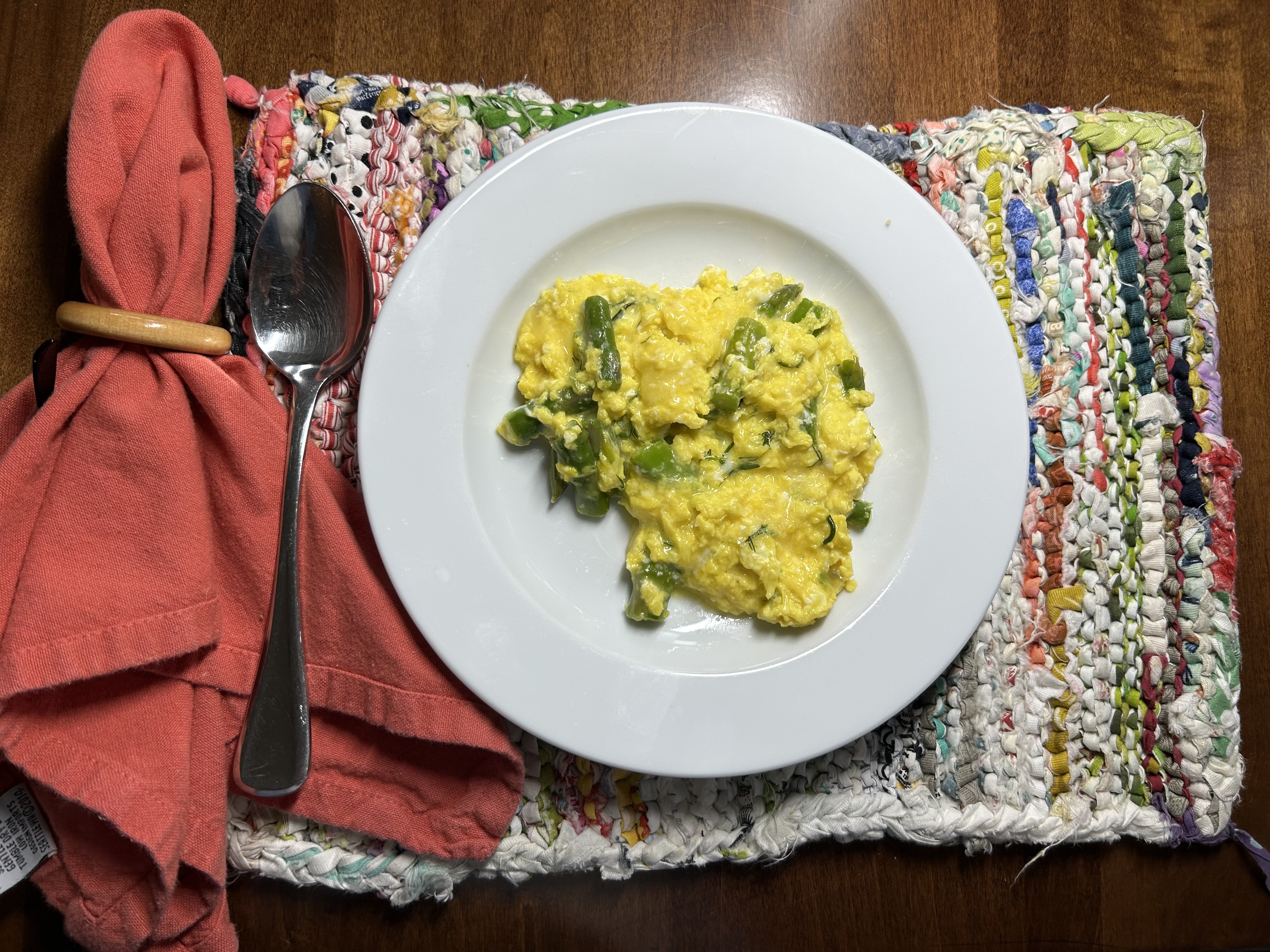 I had two lovely meals on Saturday. For lunch–I was so hungry after all that digging–I made scrambled eggs (local eggs that are soy and corn free from Local Jo’s Natural Foods ) with raw butter, fresh rosemary from the pot on the porch and fresh dill I bought, and some mozzarella cheese. It was quick, rich and delicious, and perfect.