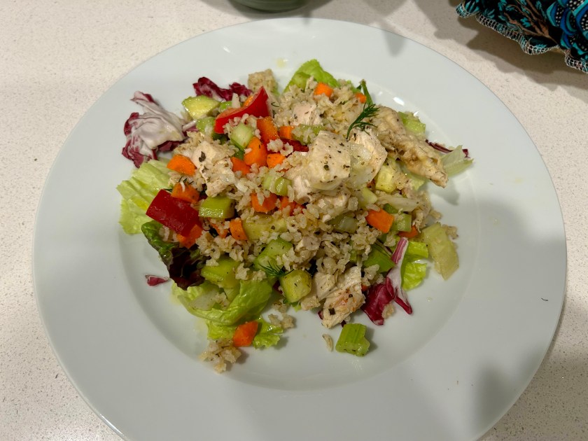 For supper I defrosted some cooked rice and made a rice salad, using the last of the roasted chicken, herbs, lots of fresh veggies, and I put it all on lettuce. The Organic Roots olive oil is so delicious in a salad like this one. (I have enough leftover for one more meal.)