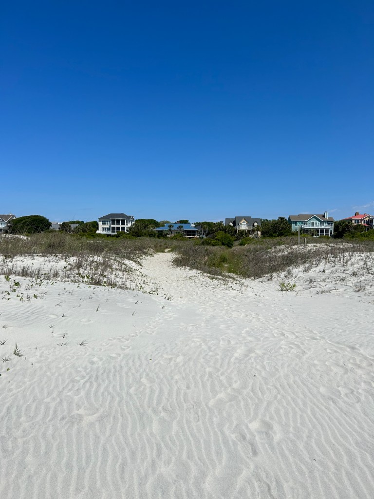 The entry paths are marked by yellow barrels and the path number on both the street and on the beach. The path number is keyed to the island street numbers, which ARE numbers with few exceptions. Low numbers start in the south and increase as one moves north. Many local beach visitors leave their road shoes in the sand near a barrel or the path’s end–to be retrieved on the way out.