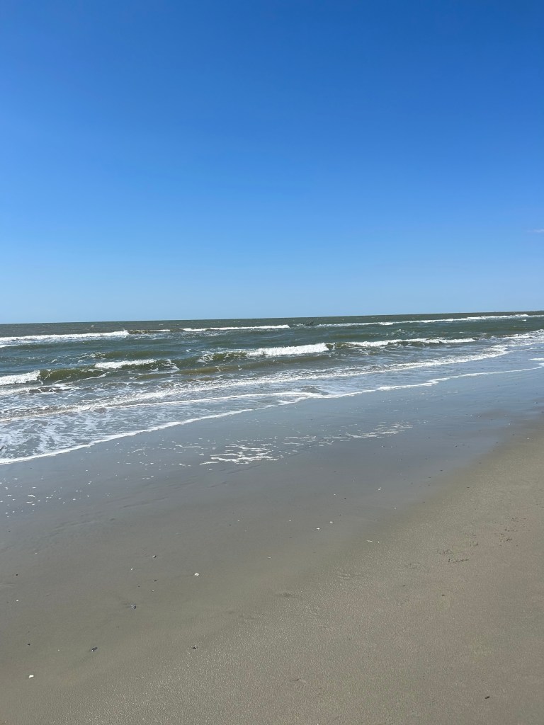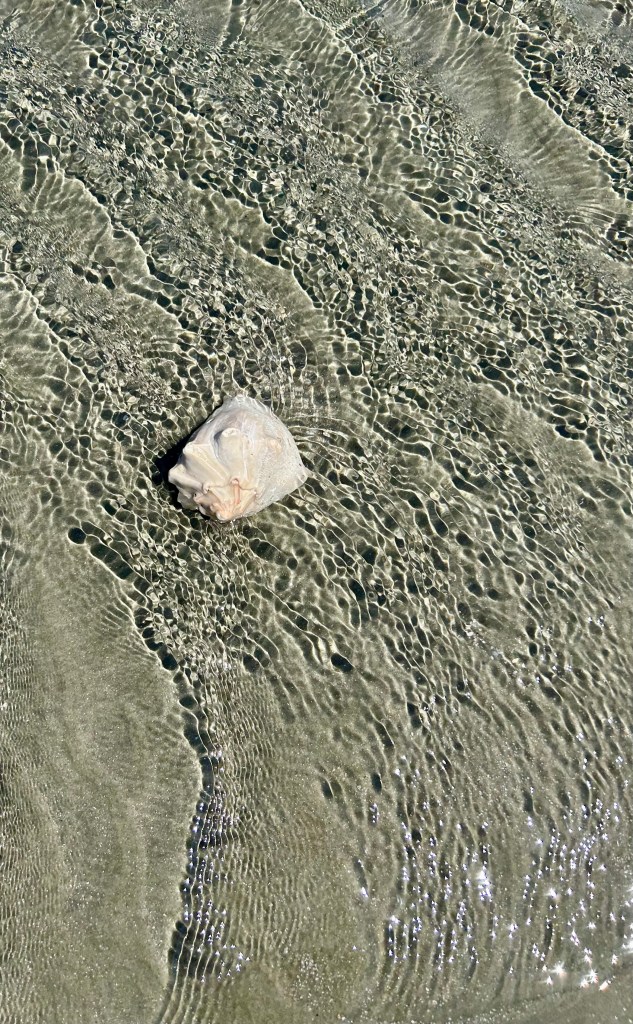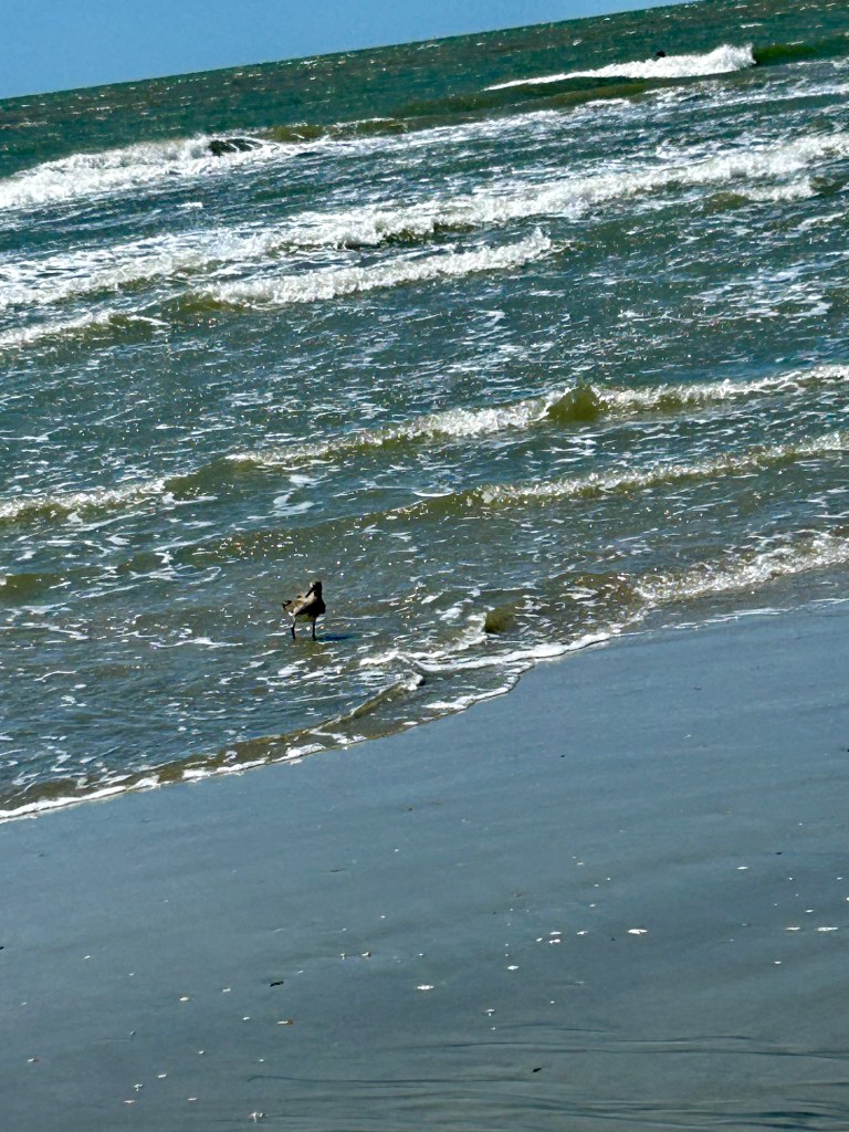 The pelicans were hunting further out. They fly in chain lines–like one sees geese fly–and dive into the water. Or, they all alight in the water beyond the wave breaker line. I tried for a picture when they flew over my head, but didn’t get my phone camera organized fast enough.