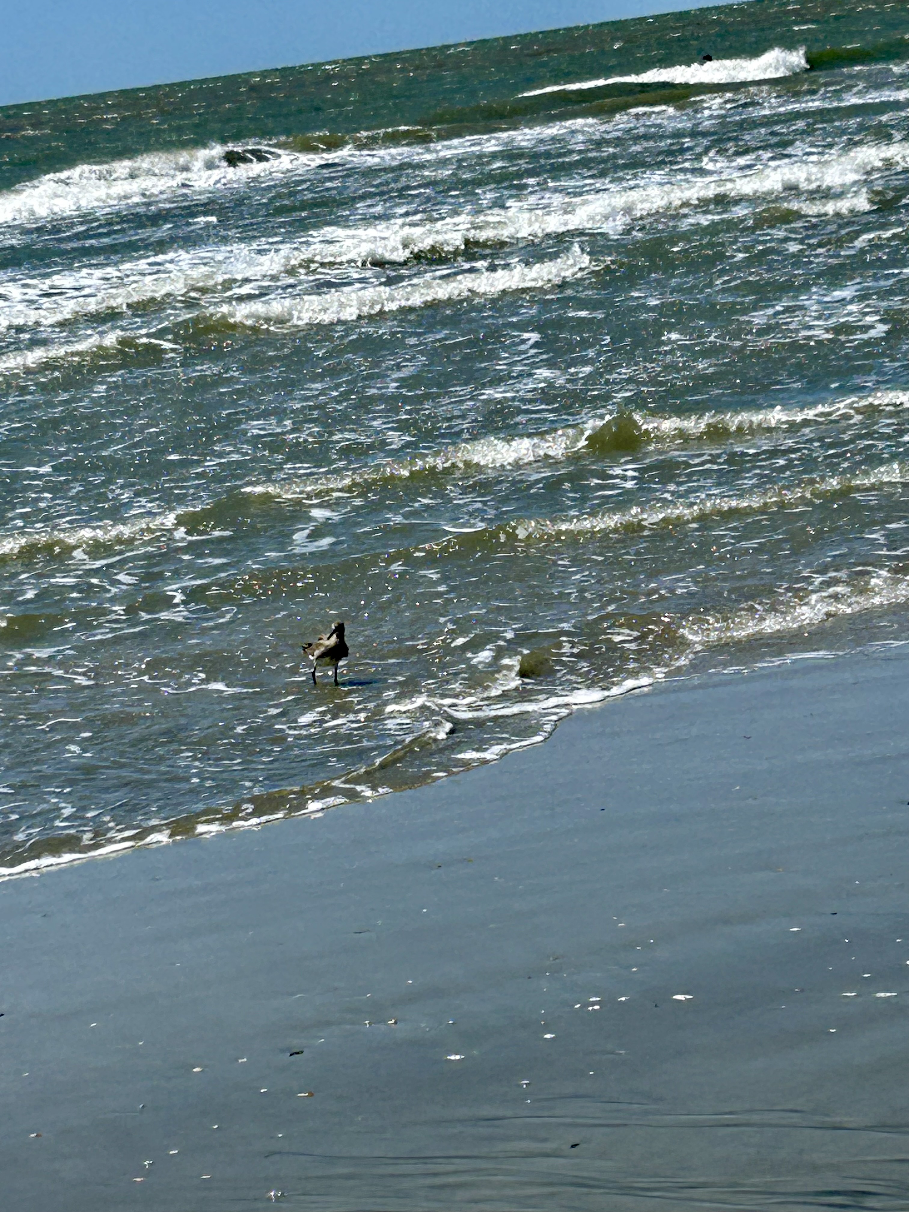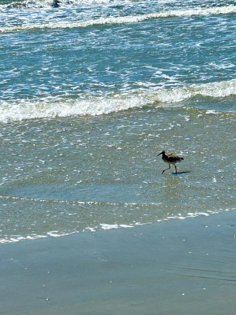 I think it is time to get a refresher on the various shore birds. I remember the little, very active, sand pipers (sanderling family). But what is this bird, with his/her distinctive black legs and long bill? S/he was energetically dining on something in the sand in the backwash of the waves.