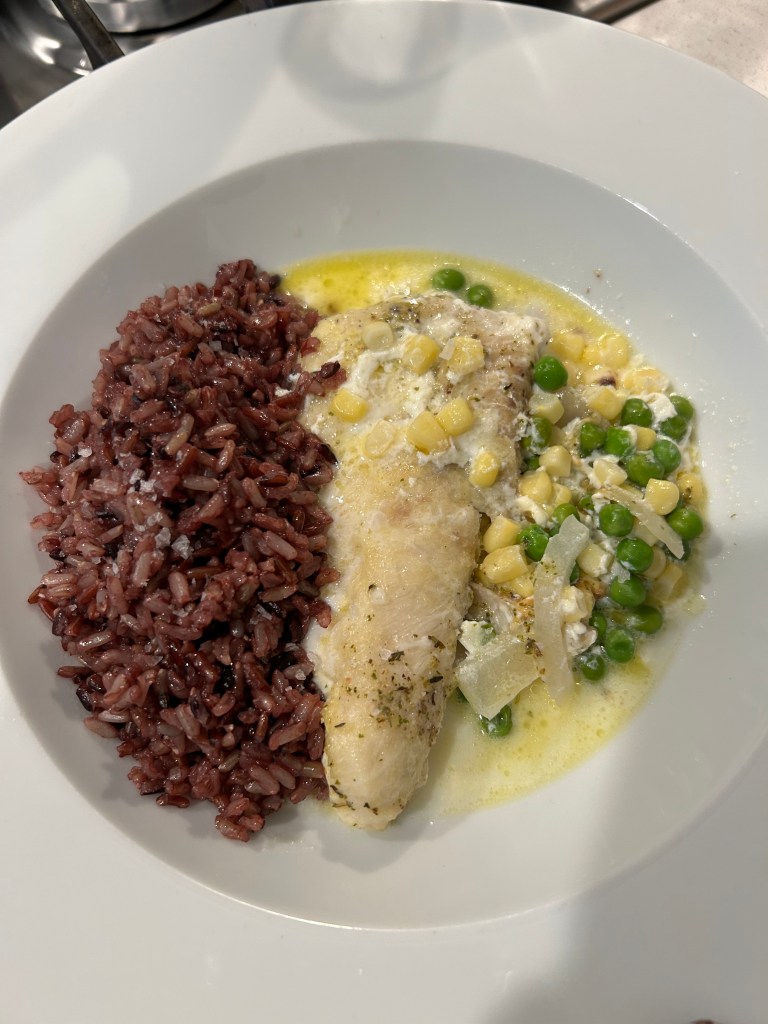 While the fish baked (30 minutes given the frozen veggies), I cooked some mixed brown rice to add to my dish. Actually I started it first as it takes about 40-45 minutes on very low heat to cook until tender. I am loving the smaller two burners on my gas oven that allow for this very slow cooking of rice and my espresso coffee pot.