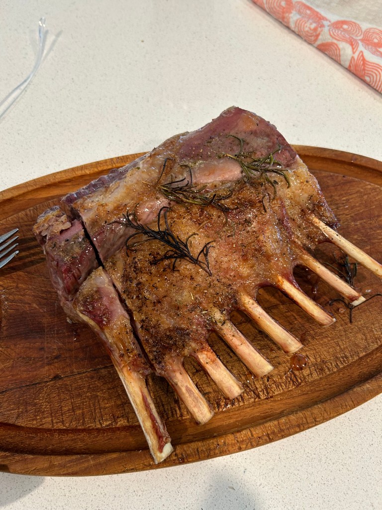 Here was my dinner yesterday–a roasted lamb rack, baked sweet potato (a half) with raw butter, roasted zucchini rounds, and some fresh veggies.