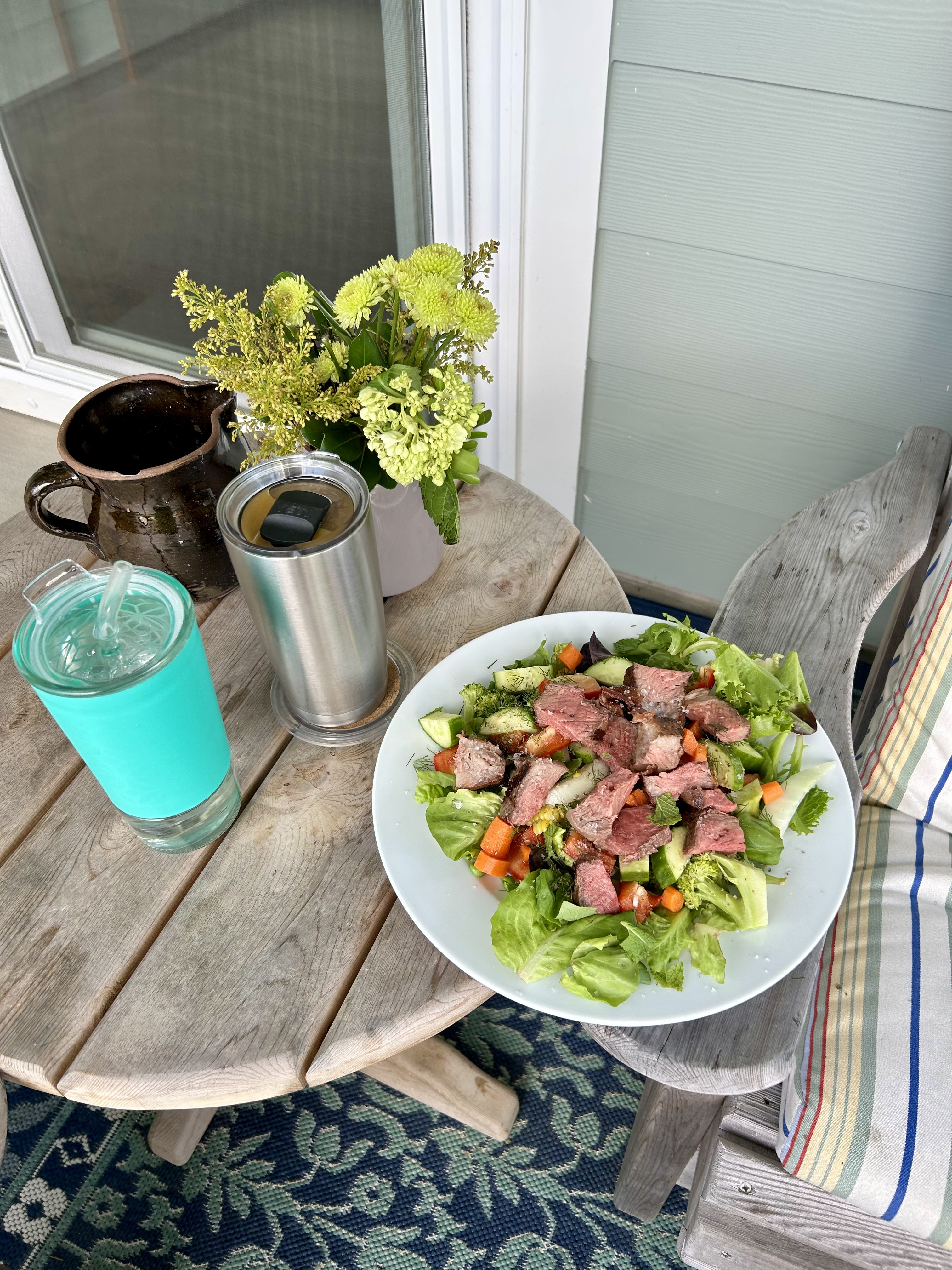 And I put my dinner portion of steak on a big salad as that just felt right today. In addition to a lettuce medley, I had cooked food “assets” in the refrigerator that I added (corn taken off cobs, broccoli, little green peas). Fresh food additions were carrot, red pepper, sweet onion, cucumber, and fresh herbs (dill, mint, basil) added to a shake or two of a dried herbal mixture. Dressing was my Organic Roots Koroneiki olive oil. And, flaked salt, of course.