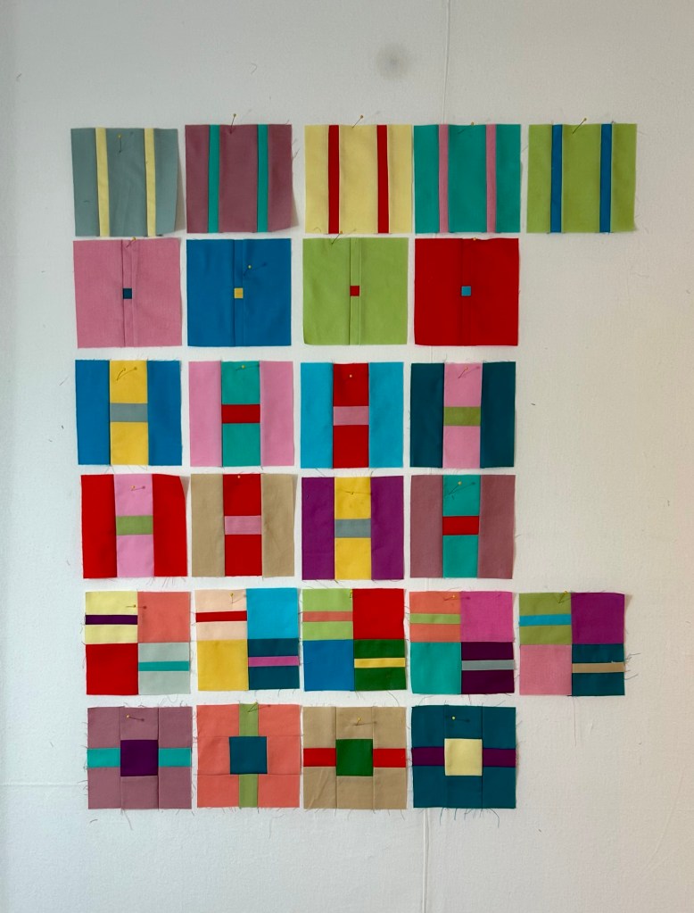 I’ve completed the second set of the Summer Camp mystery quilt (Modern Quilt Society) and am looking forward to the third round this Friday. These blocks are just so much fun. The blocks on the 3rd and 4th rows were made by cutting a set of blocks from the first set into two pieces and adding borders–a process I thought quite clever.