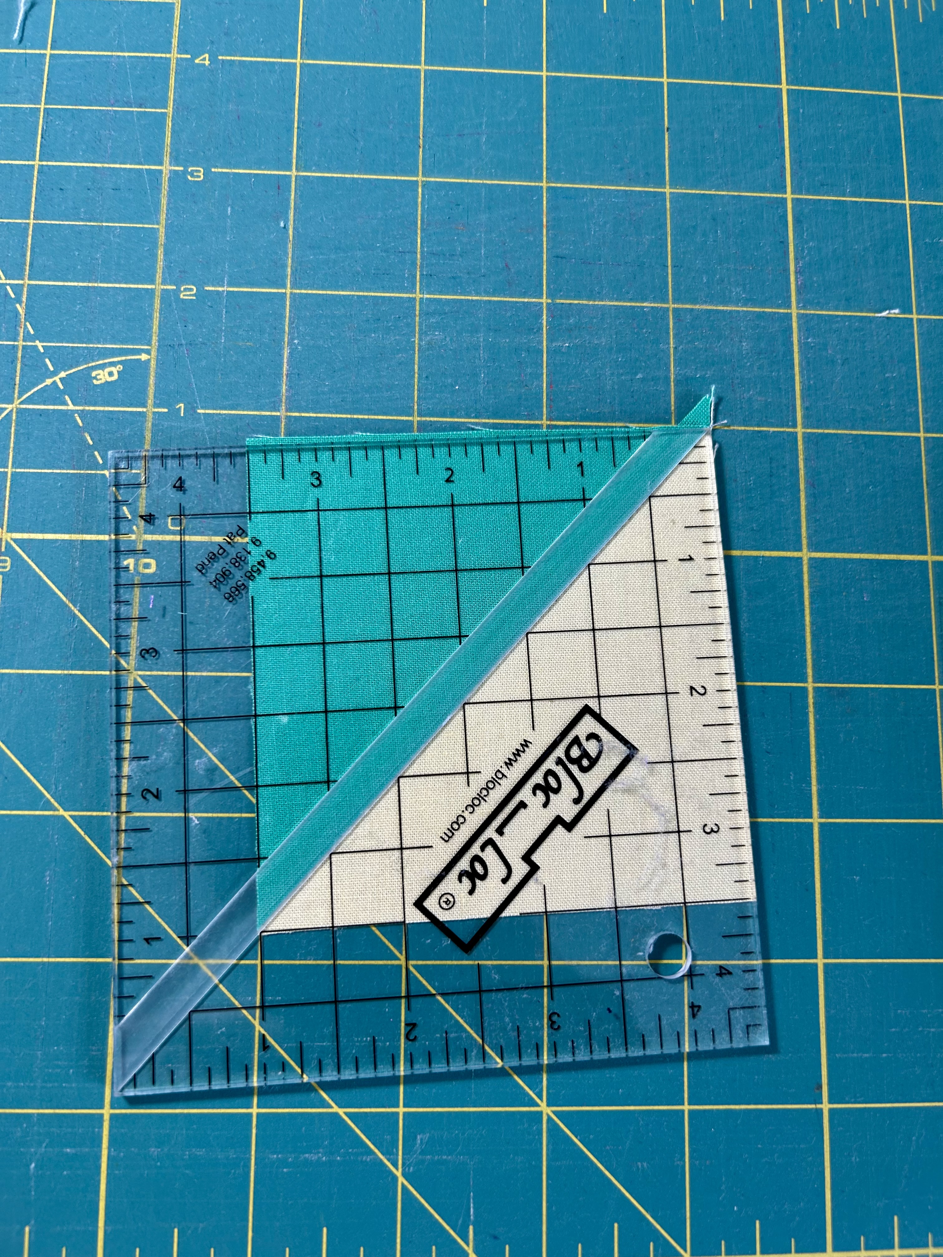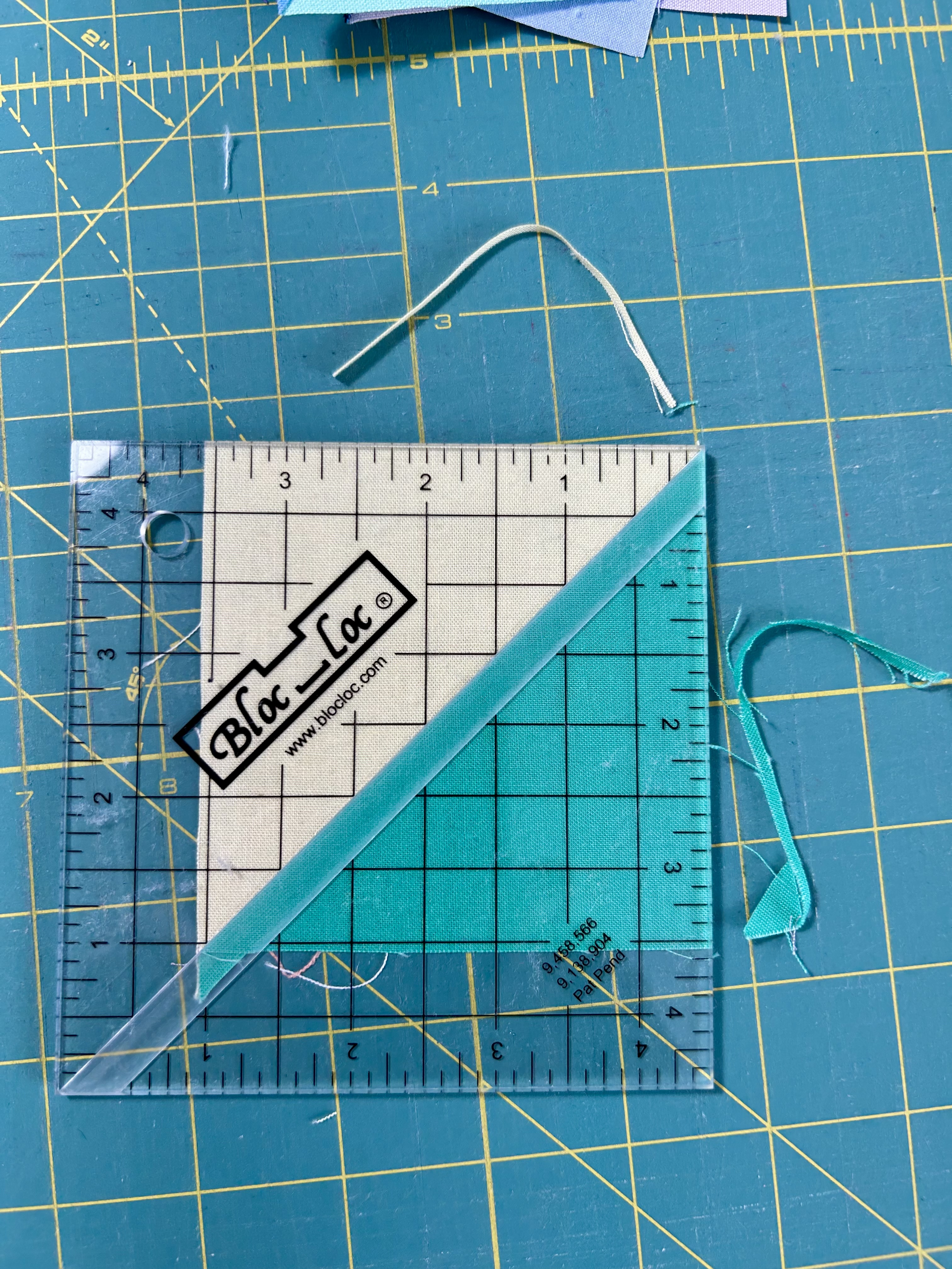 I layer the two squares and use a quarter-inch ruler strip (I love these rulers too) to mark the sewing lines on the light square. This method is more labor intensive, but also makes a clean unit that never needs resewing as the trick is in the sliver trimming with the Bloc-Loc ruler, not in the perfect sewing of two triangle units.