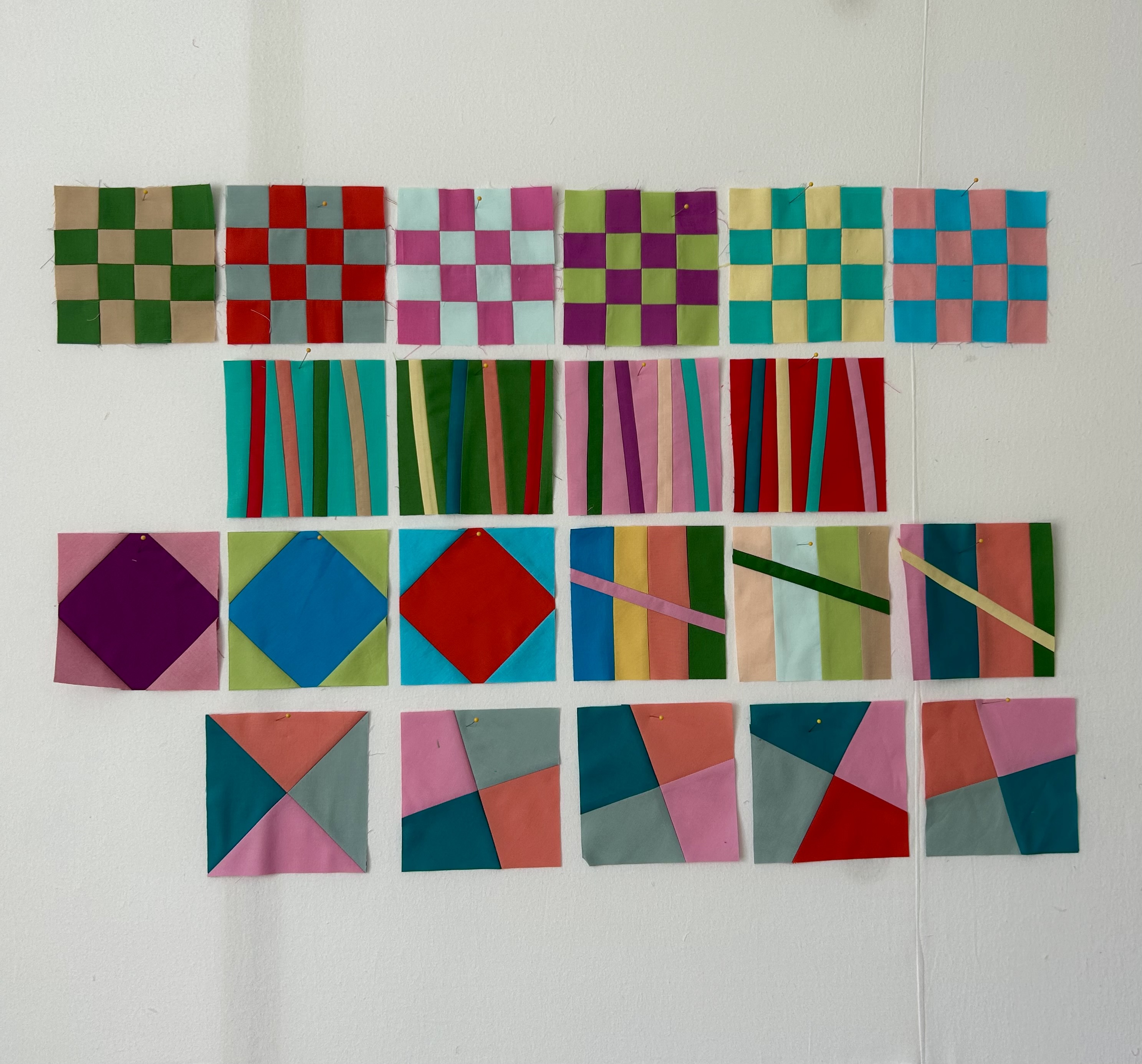 But, first, here are the 3rd set of blocks for the Summer Camp Mystery from the Modern Quilt Studio. There will be 6 installments, and the next set comes next Friday. After the 4th set, I may pin all the blocks so far to the design wall to just…admire them? Yes, admire and pet, but also to see how my palette is working together and if I need to make any changes.