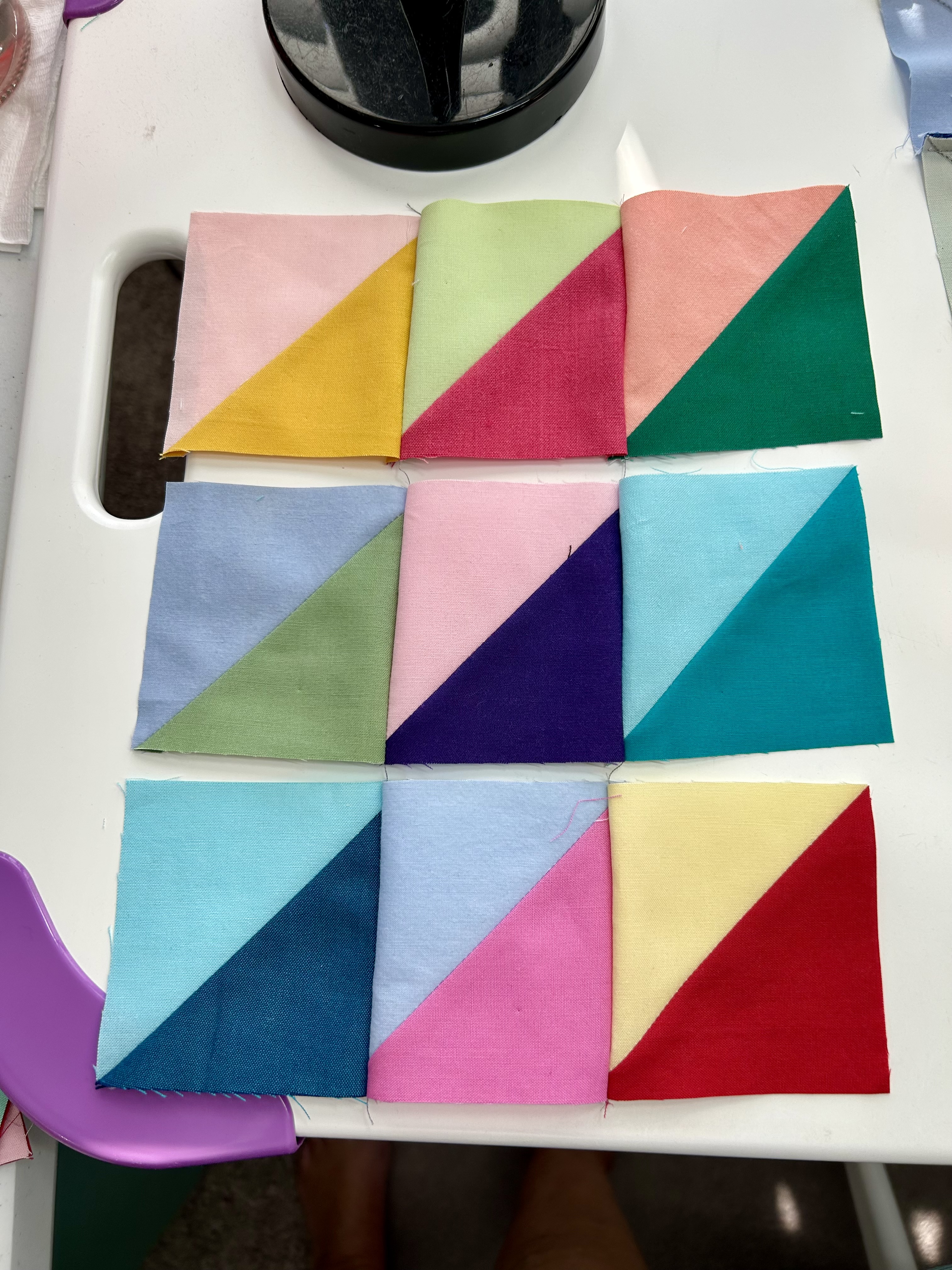 First, lay out your units in the correct order. Then sew the top 2 units on the top row together, left to right of course, leaving aside for the moment the third unit. Chain down and sew the next two blocks (the second row) WITHOUT cutting the thread to the first row. Then do the next two blocs (the third row down). NOW you can cut the thread or chain piece something else so you can cut off your string of blocks that are “webbed” together.
