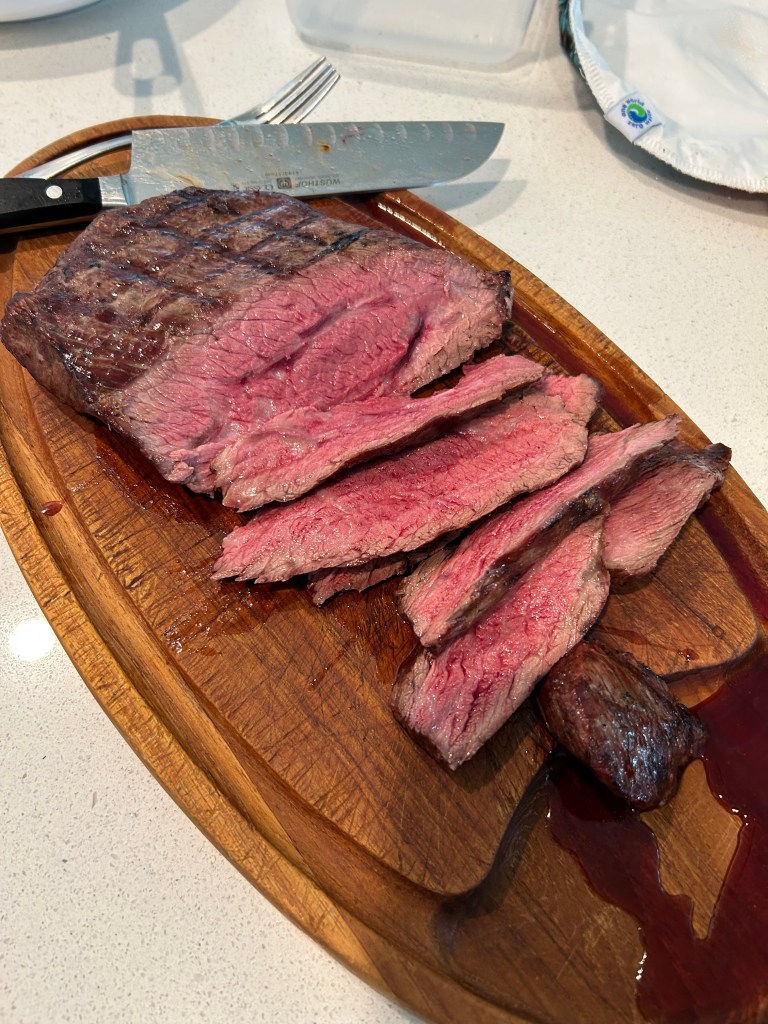 Yes, I like rare meat. More of the nutrients are preserved in rare meat than well done, and it is way more tender. You want to cut flank steak on an angle and in thin slices.