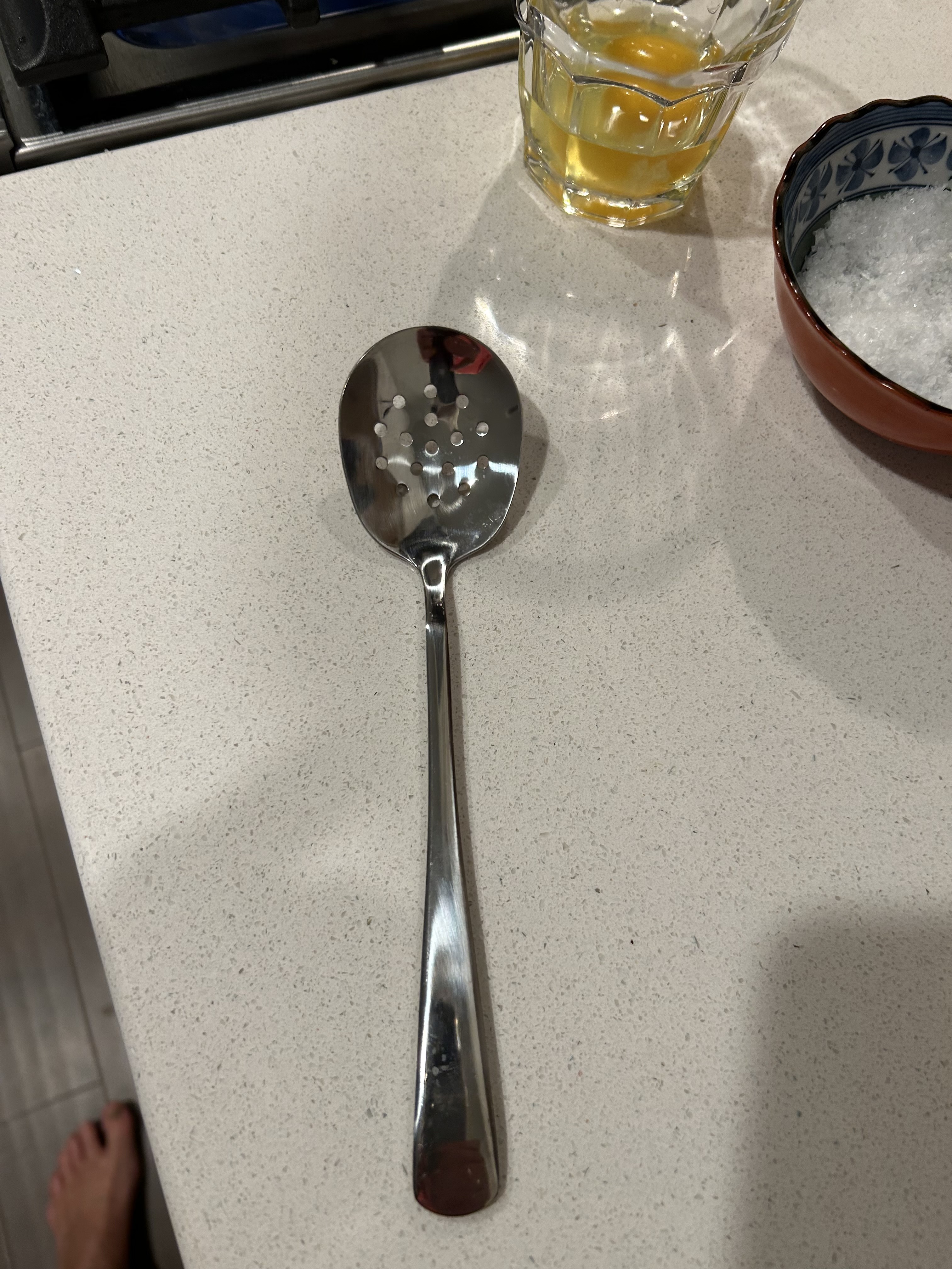 And you need a utensil with holes to pick up the egg when it’s ready to your satisfaction. A flat spatula works well too.