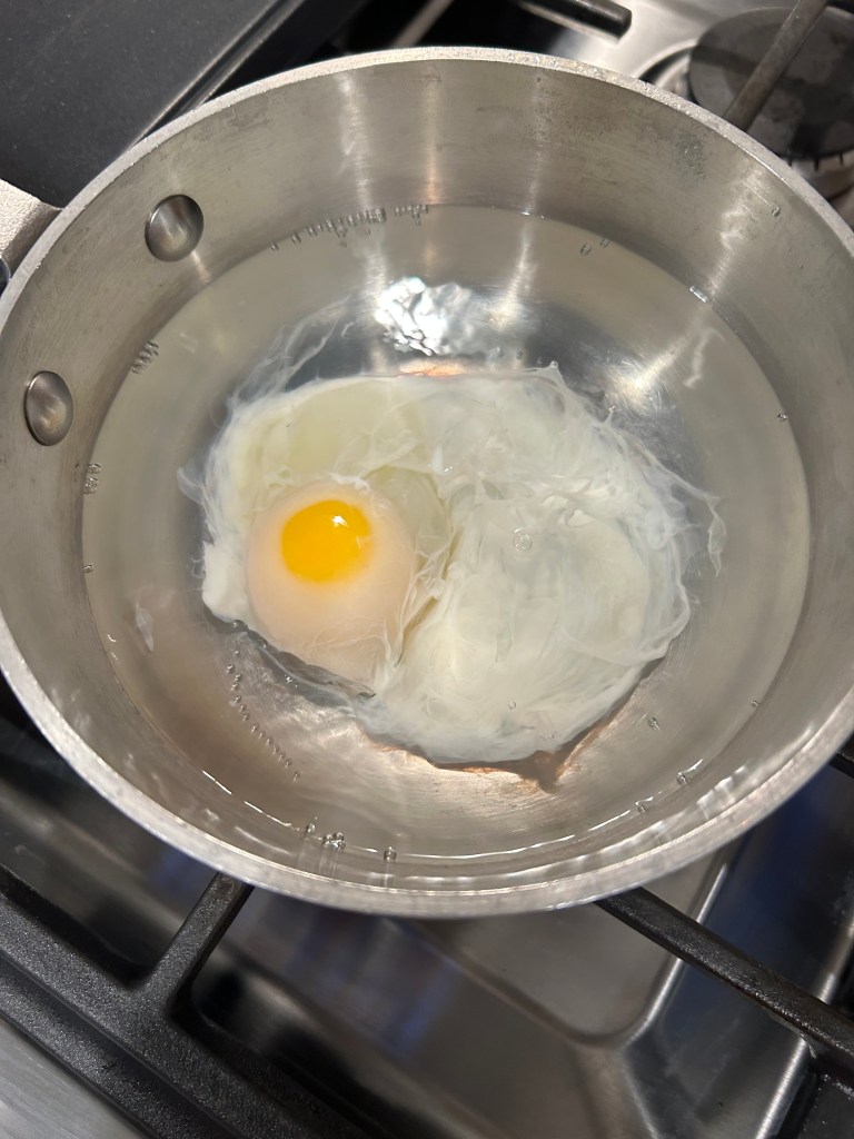 I wasn’t terribly hungry after the large and rich dinner at noon, so I just soft boiled some eggs in a pan of water–yes, I’ll do a future post on how I do this quick and easy task. These poached eggs are velvety soft, and you can make them as hard or soft as you like.