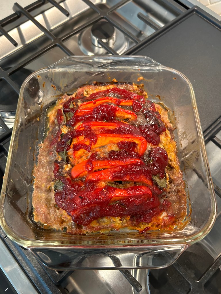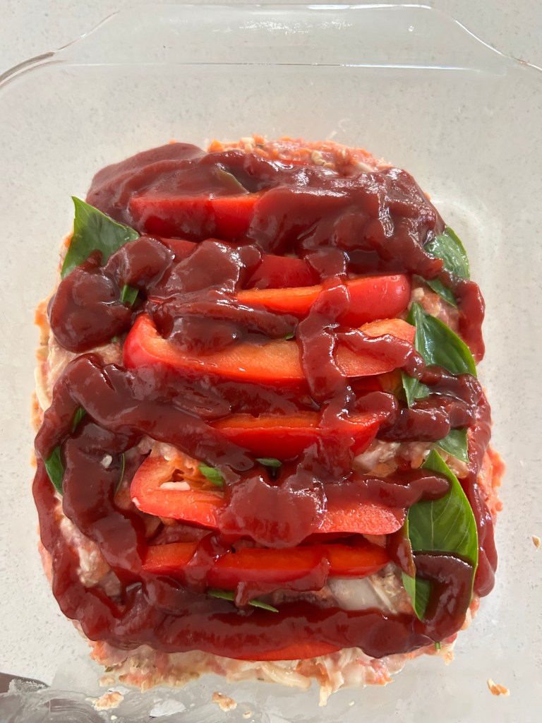 I added some Annie’s Ketchup to the top as it is the only ketchup I can find that has a few ingredients. Ketchup is the closest I can get to tomatoes these days. I use it only on meatloaf and don’t add it too often.