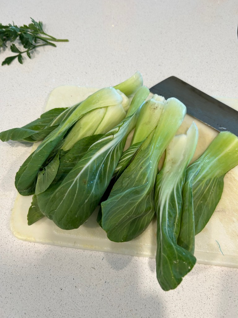 Meanwhile, I washed and chopped two baby bok choy. I love that vegetable and often flash stir fry it in a good fat with seasonings. I do not like it overcooked–the bigger stem pieces should be al dente.