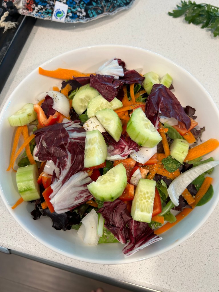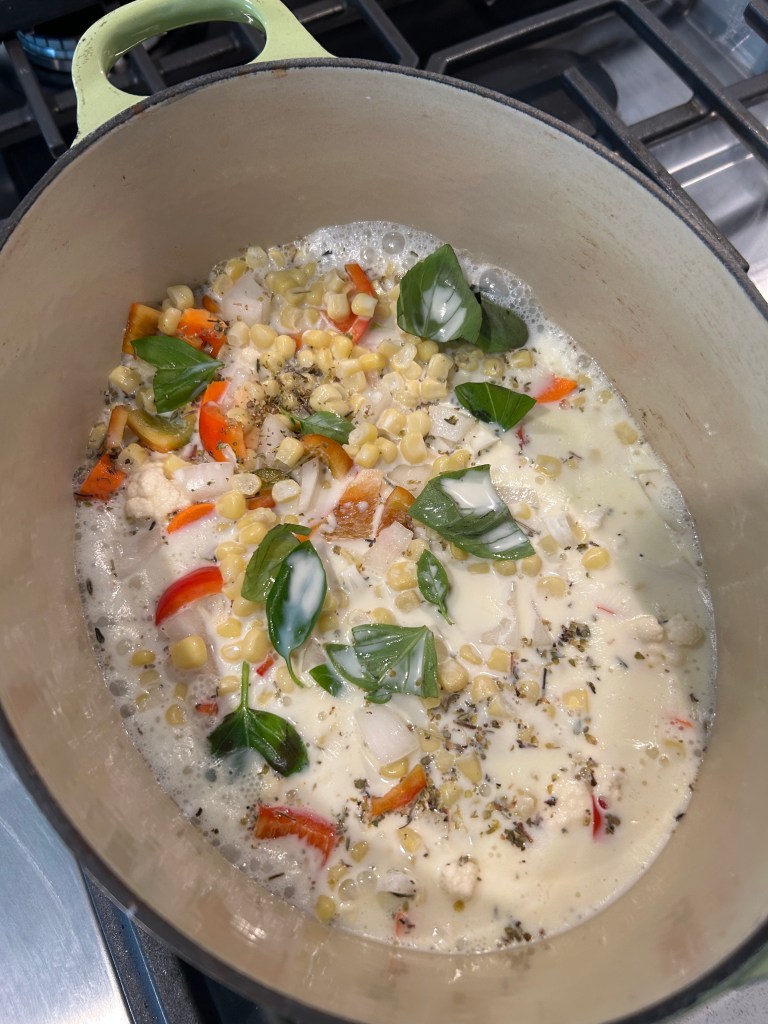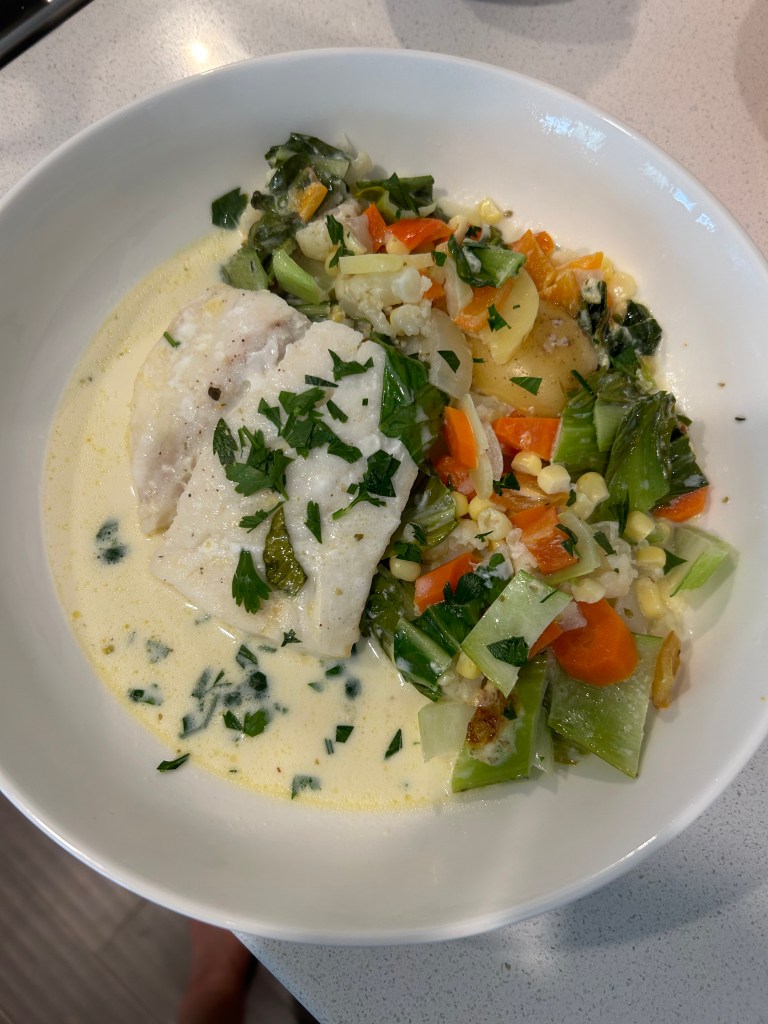 While the fish was cooking, I put together a salad for supper. I could either top it with the other piece of fish or add some other protein. If I used the fish, I’d still have a nice chowder to eat–and I could always defrost another cod fillet and bake it for the salad or the chowder.