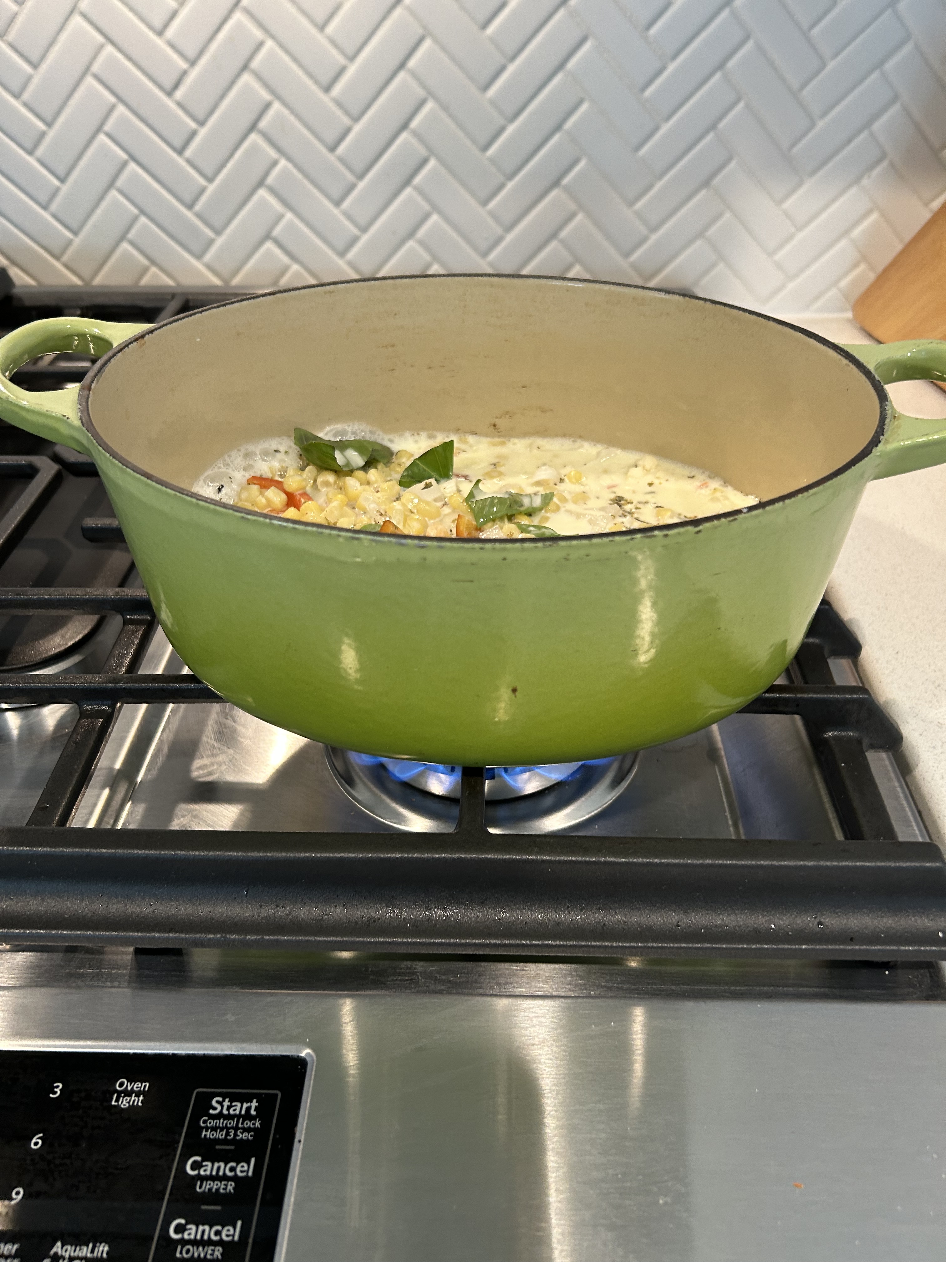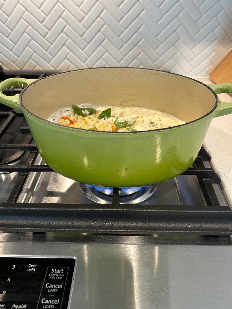 I layered the bottom with two small unpeeled potatoes (a little bigger than eggs maybe) into the bottom of the pan–thinly sliced. I added some diced sweet onion, carrot, red pepper, and some frozen corn. Salt and basil from the garden went in on top of the raw whole milk.