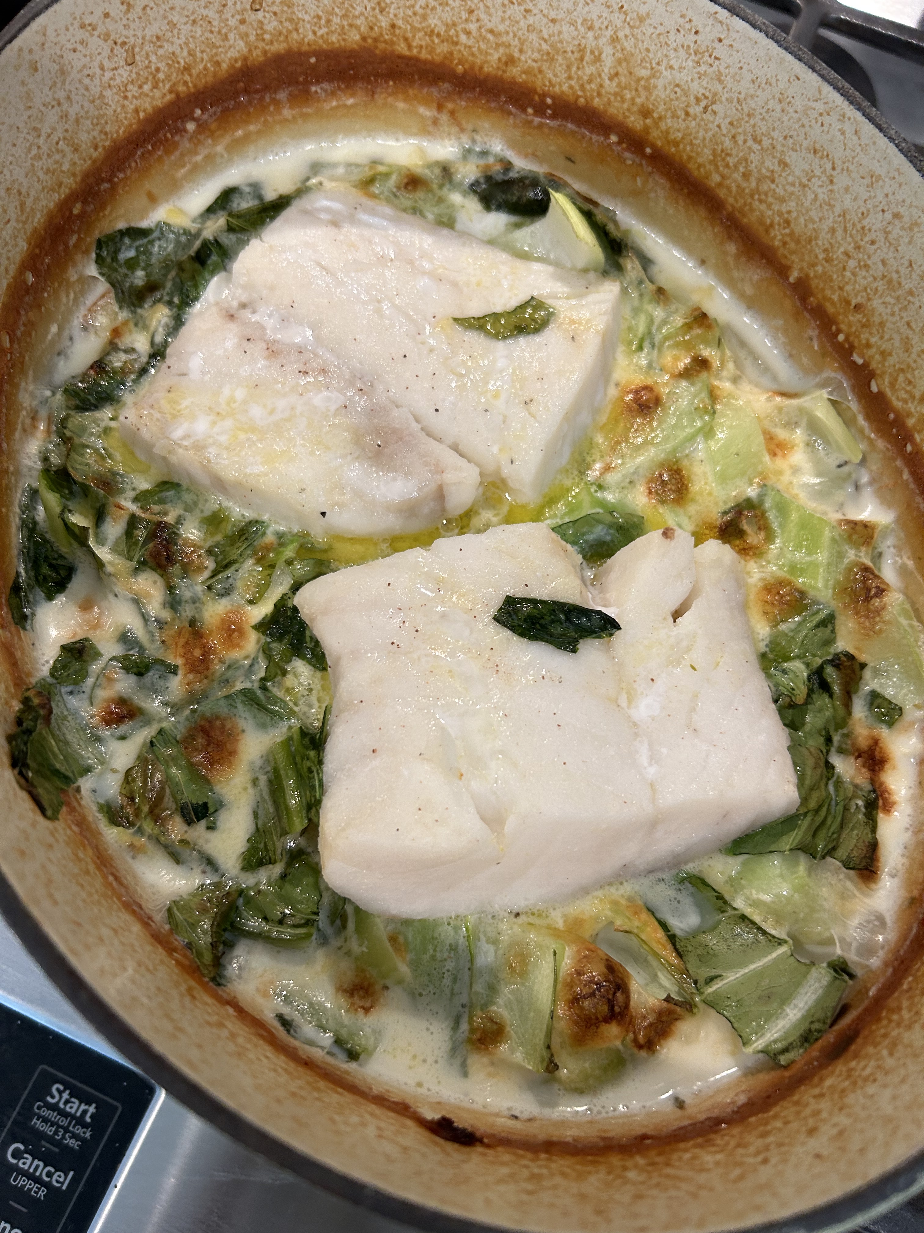 I layered the bok choy on the top and put the fish fillets on top of the mixture. I added more salt and some butter on the fish. I covered the dish again and put it in the oven for 10 minutes and then uncovered it for 10 more minutes. My oven does not brown well, so I broiled the dish for about 5 minutes–keeping a close eye on it so I didn’t burn it. I wanted a little color, that’s all. The fish were done.