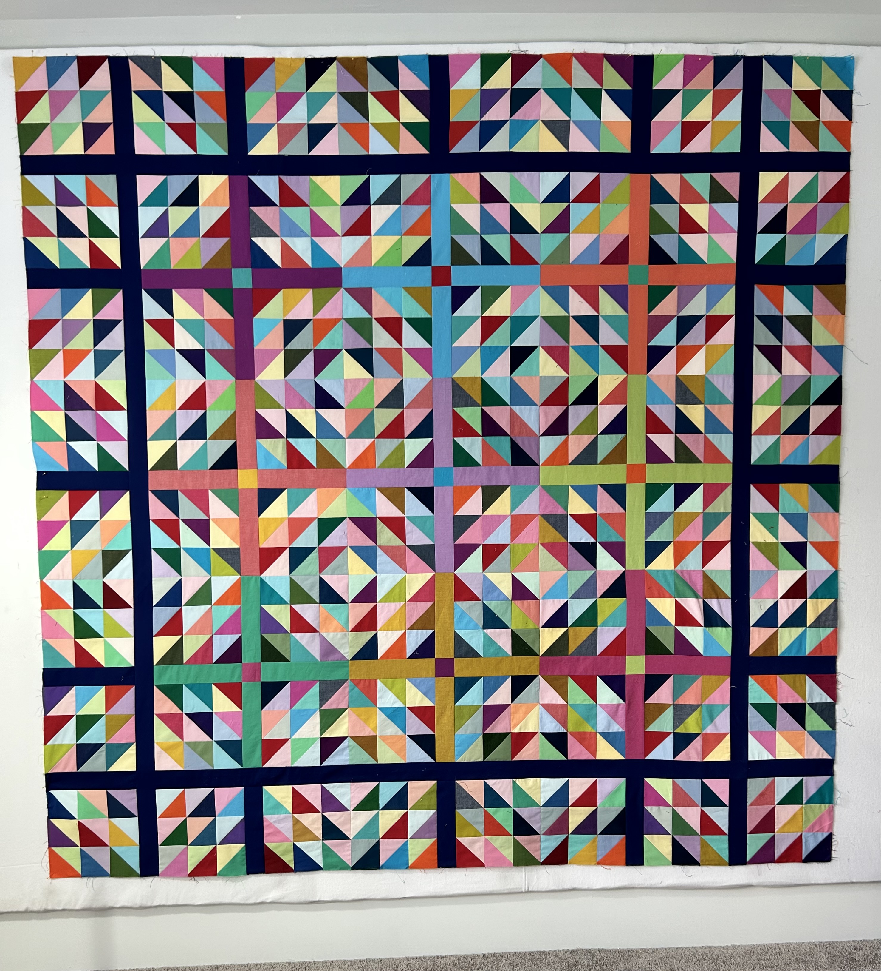 The blocks are 9 inches finished, so it will measure out about 82 inches square. I am thinking of naming it “Inspired by Tara Faughnan,” since that is the truth and since I adore her quilts. She just released a lovely pattern made with solid half-square triangles–but without internal sashing. However, I was drawn to my idea below by a quilt that hangs behind her on some pictures and videos.