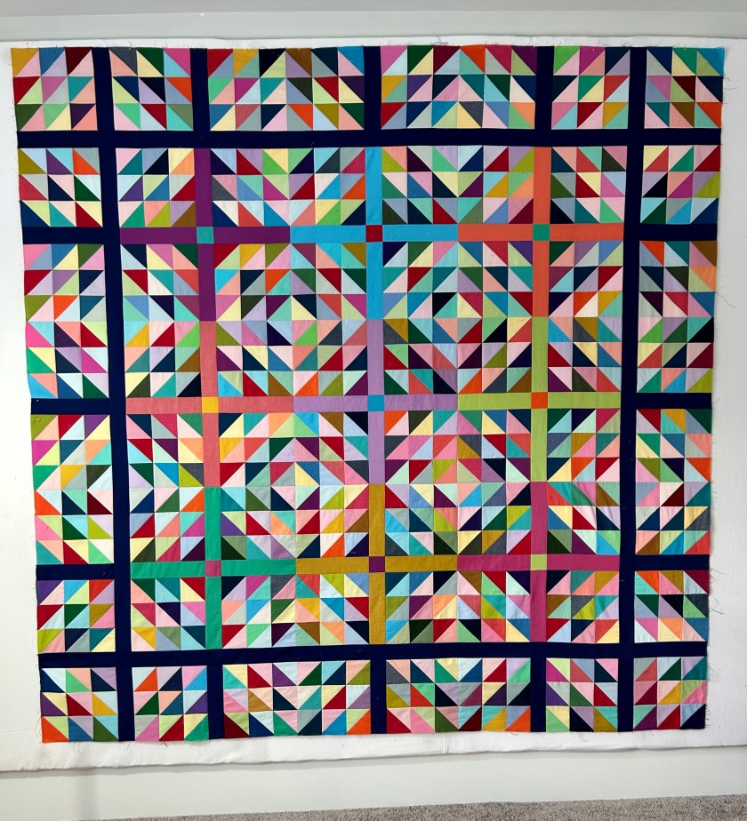 I finished the half-square triangle quilt made mostly with solid scraps–at least it started that way. But soon I did have to cut some fabric from my stash of bigger pieces as I got picky about balancing colors around the quilt. And don’t laugh, but I did order a few colors I felt I needed when some ran out. The colors in this quilt are way more vibrant than I am able to capture on my phone and in a room where it is tricky to get light where I need it for pictures.