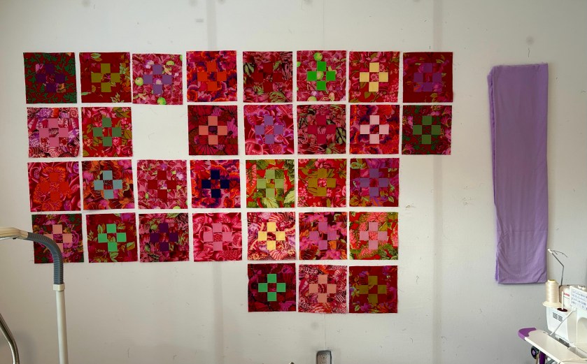 Big Red (that will NOT be its name) is now on the design wall. It’s hard to get the color red to show well in my pictures. This quilt made from Kaffe Fasset prints bought in a kit many, many years ago. The reds are vibrant and not at all muddy. The lavender (Kona Thistle) will be the 1-inch sashing and the binding. The 8-wide 10-inch blocks will go right to the edge, so using the same-color sashing fabric for binding will pull everything together. Right now it would finish at 87 wide, but I might go at least one more row long so it wouldn’t be square. I’m not planning to use corner stones between the rows, but you never know what will happen. And of course I’ll move blocks around like crazy as I add them.