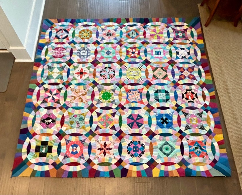 I started this quilt in June 2018 and there are, literally, a hundred thousand or more tiny stitches in it. The prepping of all the templates also took many, many hours. Five years, and she isn’t totally finished yet. But, soon… And she needs a happy name–maybe even “Happy”–as in “I’m happy this one is finally over.” I’ll put on a hanging sleeve before I bind her. And she is the last of the handmade quilts for my seven grandchildren. Now there are seven of these handmade quilts.
