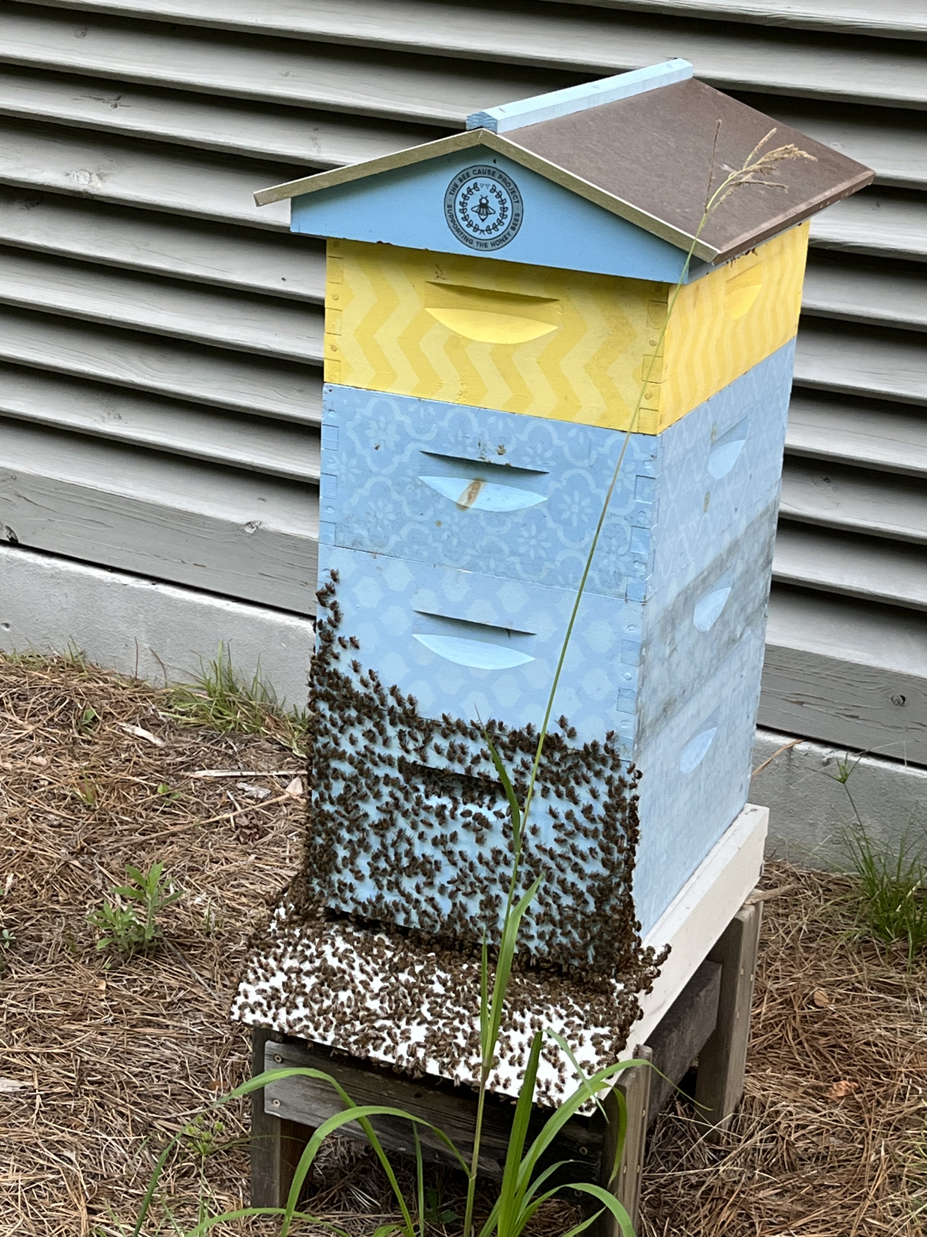 Here’s the hive earlier in the year with three supers installed. The bottom thicker box is the brood box where the queen lives. (I think that’s right.)