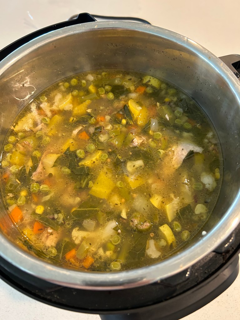 Prior to the Air Fryer’s arrival, I used my Instant Pot to cook a whole chicken. I added more liquid so I would have some good broth–and with some of the meat, the broth, some frozen veggies, and some cooked veggies in my refrigerator, I made a whole pot of soup.