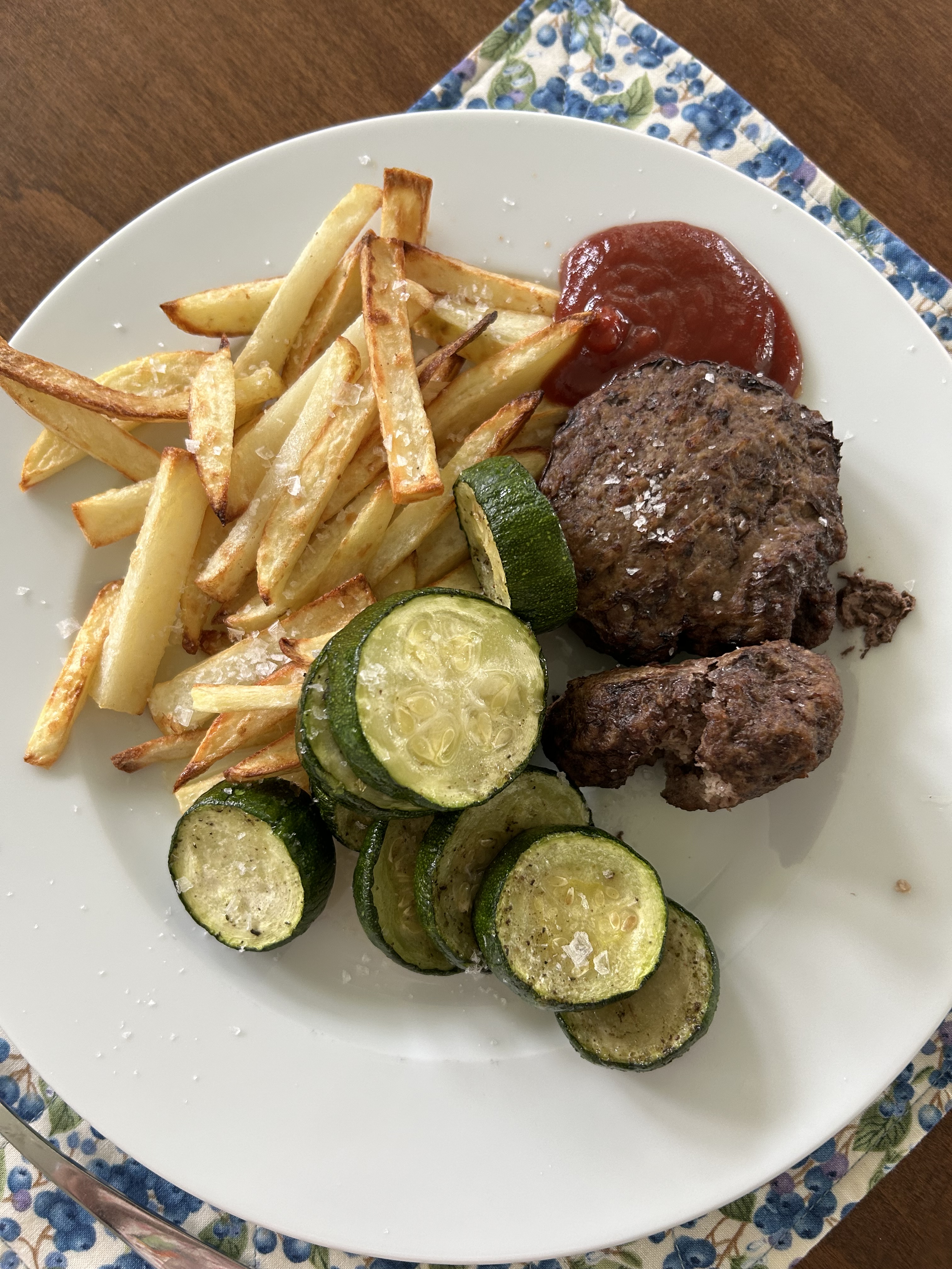 In the other drawer, I reheated a hamburger patty and the zucchini rounds I air fried the other day. I over-cooked the hamburger pattyies I made and should have paid attention to my own instincts. But the reheating went well and didn’t ruin either the zucchini rounds or the hamburger patty by cooking them more beyond warming them. LOL, ketchup helped. (I don’t like well-done meat.)