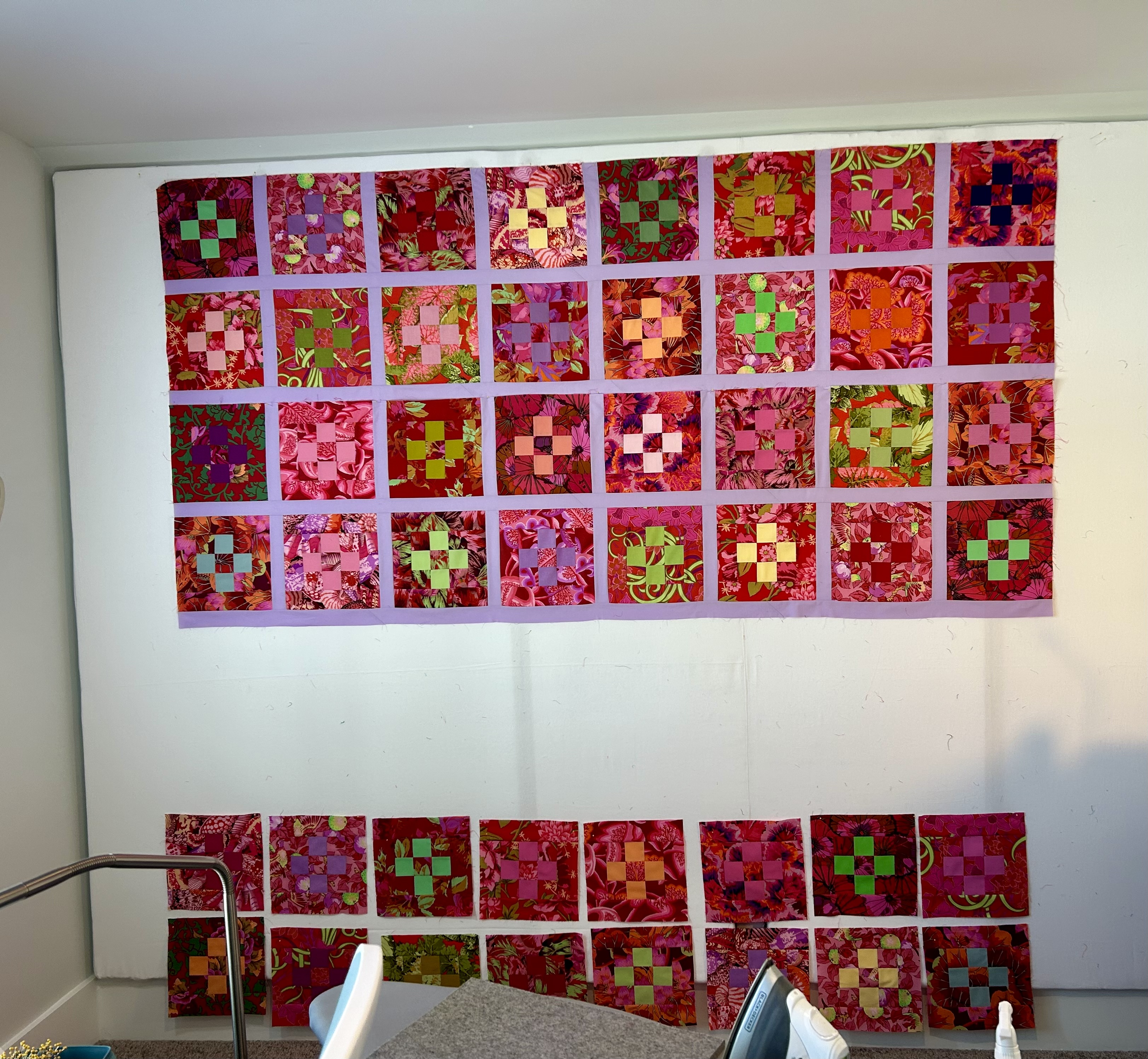 The big red blocks (10 inches) are getting sashed. Four rows are done, and sets of two are sewn together. I have to use a ladder to reach the top of the design wall, so I won’t sew those two top rows to the others until the last rows are done and connected.
