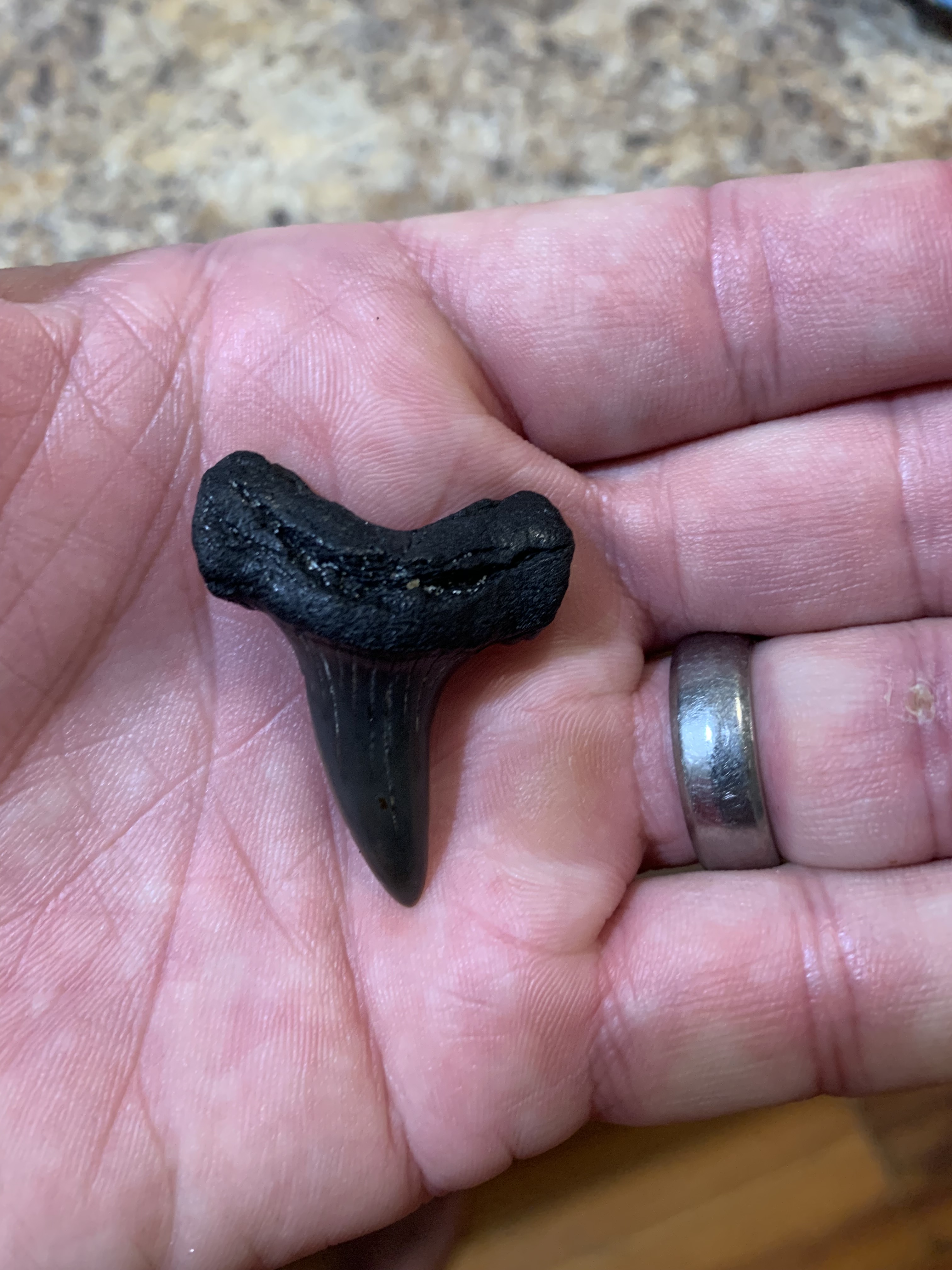 This one, found recently, is a rare find–as it is SO BIG and not broken. It is from a GRANDPARENT to the famous Megalodon shark, an apex predator back in its time. (There are folks here who can identify these shark teeth.)