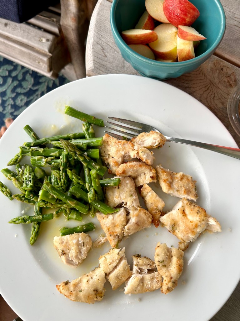 I cooked the asparagus in the picture below in the microwave for about two minutes–in a glass shallow pan covered with a cloth. The chicken tenders I put into a bowl with a little melted duck fat and then coated each one with the gluten-free panko I bought and ground finer–so there is just a light coating here.