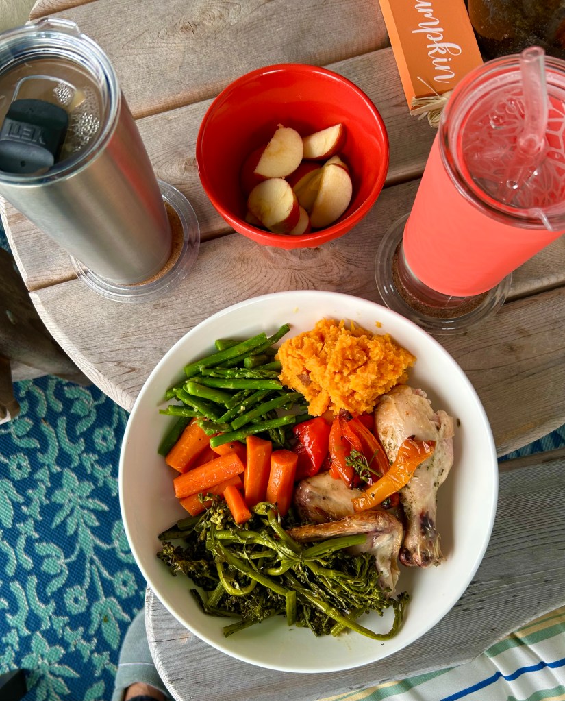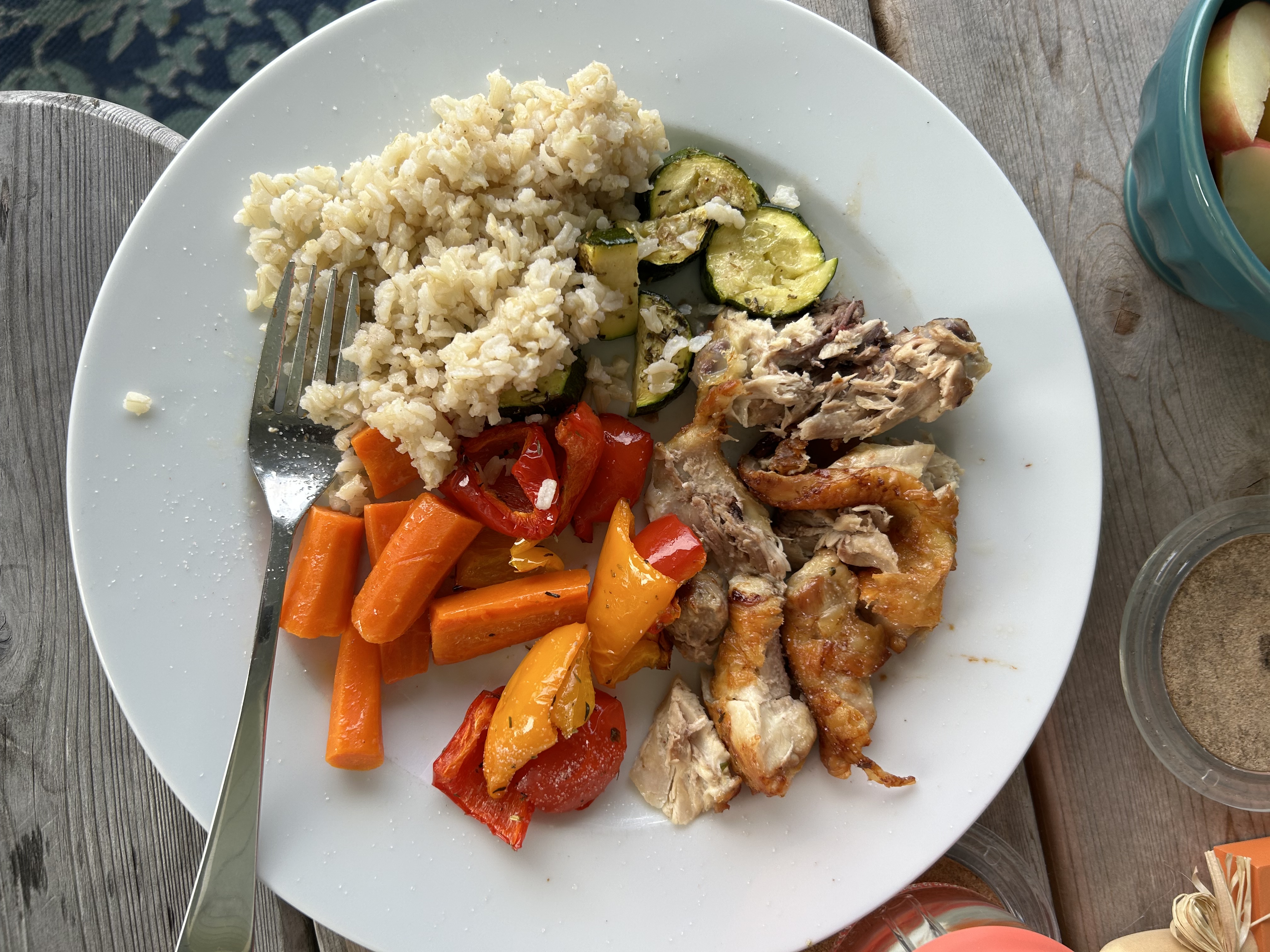 This meal was cooked in the new oven: roasted whole chicken, roasted sweet potatoes, roasted broccoli rabe, carrots in butter (stove top), warmed leftover asparagus and red peppers, and for dessert, raw apple and an espresso. It’s a feast–with great leftovers so I have time to do other things.