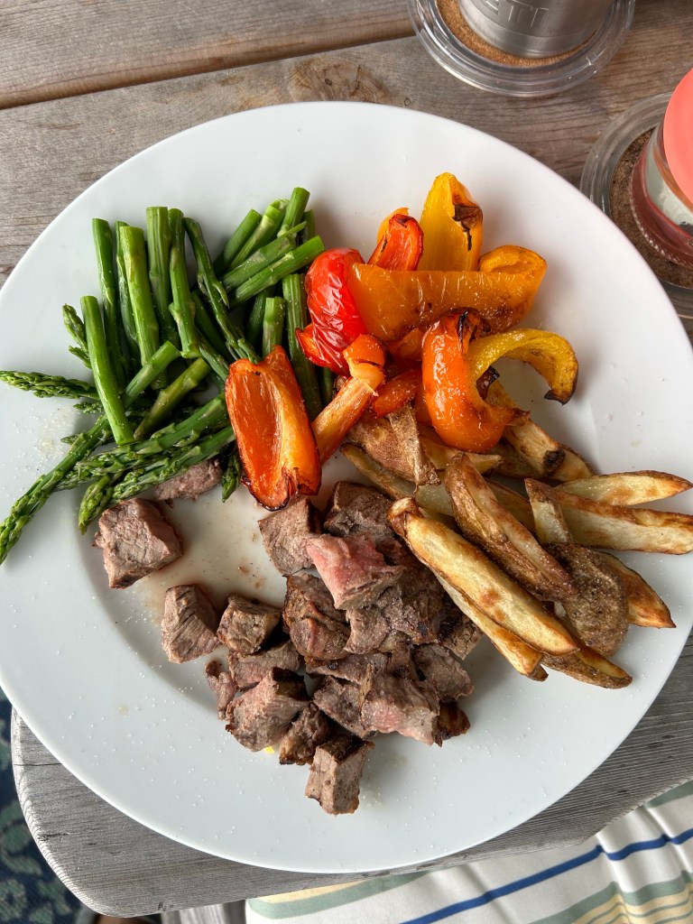 And look at the 15-minute, or less, French fries with their skins left on. Plus, more roasted peppers. That’s leftover grilled steak and asparagus cooked in the microwave. I only use a very tiny bit of soft duck fat to coat the fries.