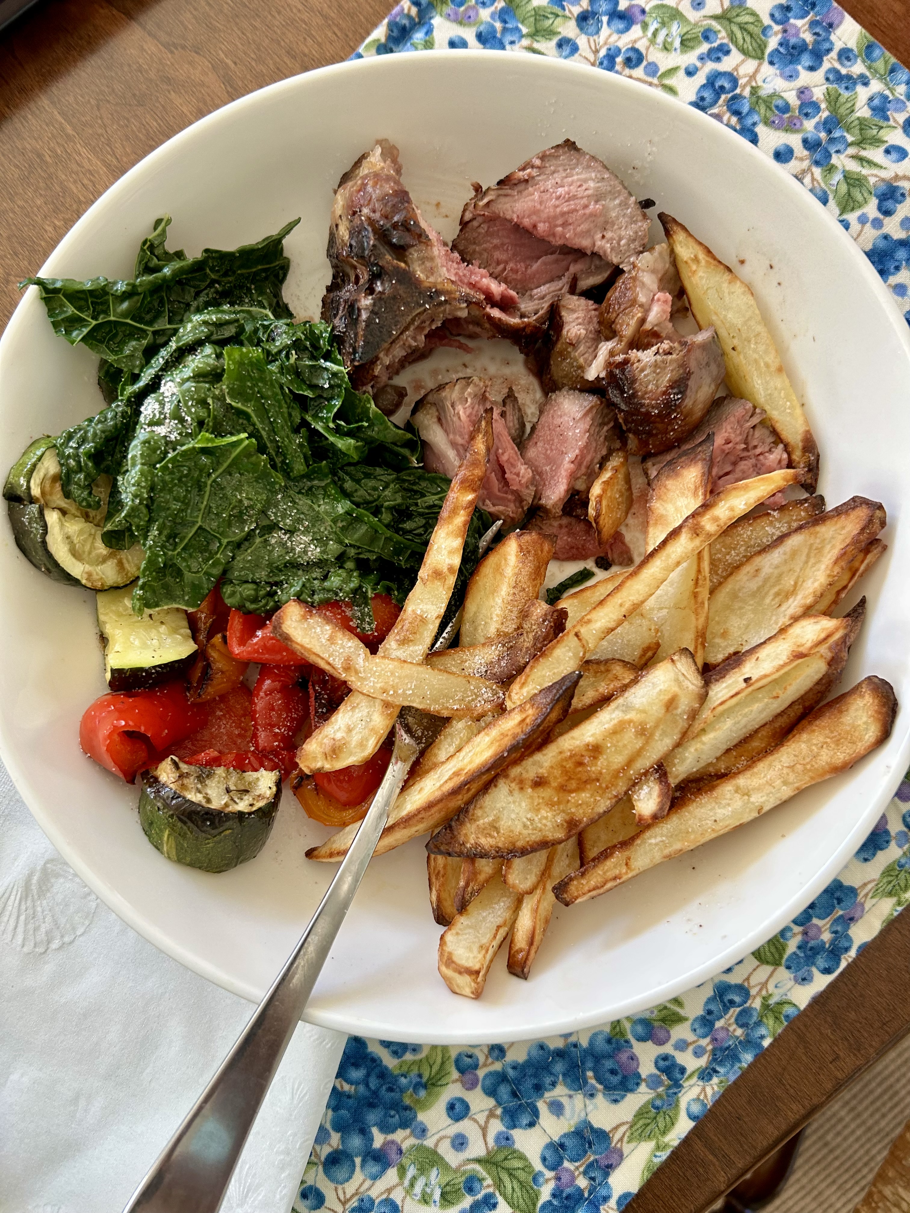 Lamb chops with roasted red peppers, kale, leftover air fryer green beans, and Carolina gold rice (more on this rice later). I cut up my meat when it goes into the bowl so I can read while I eat.