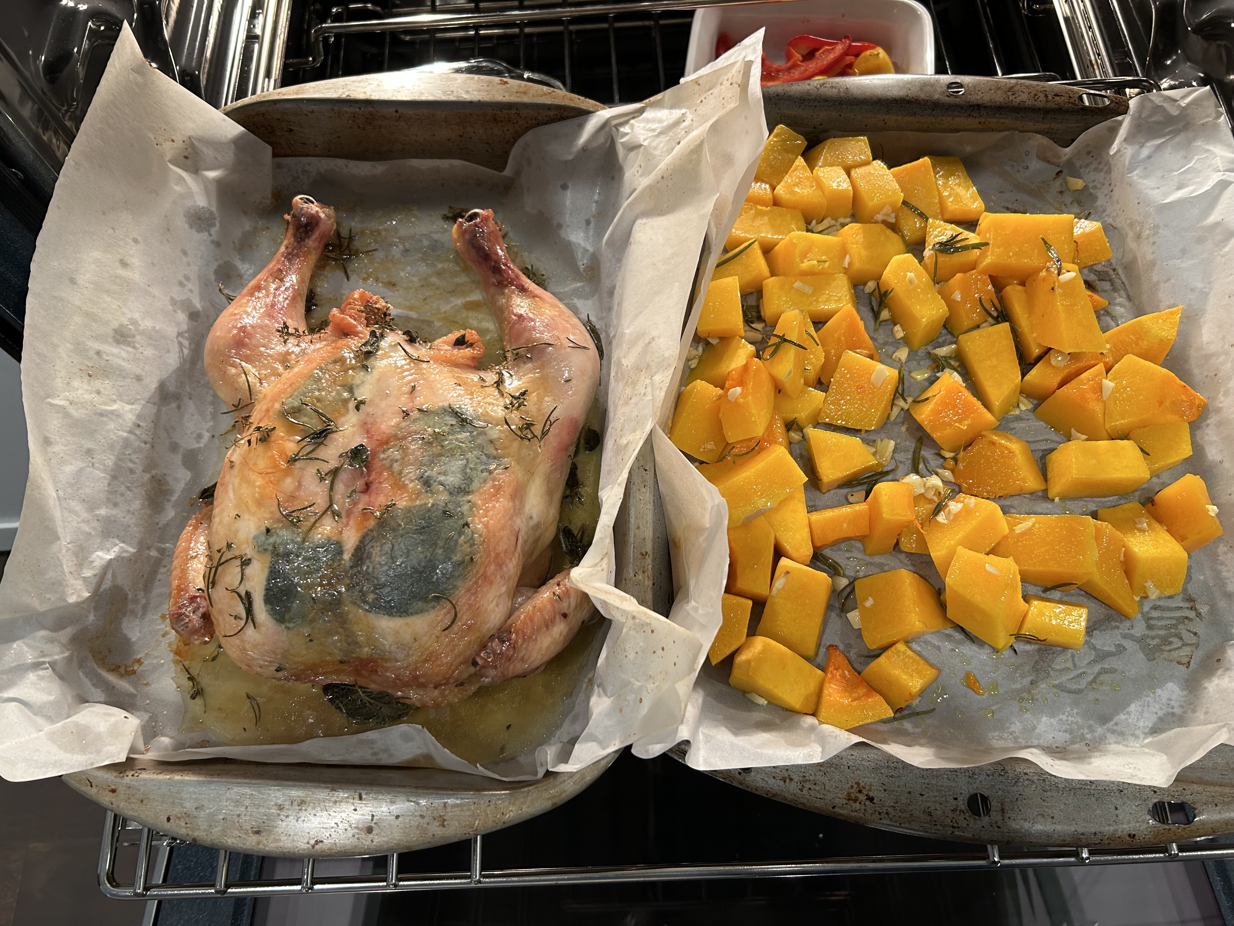 I put sage leaves under the chicken’s skin–after I spatchcocked it. And THIS butternut squash was ripe and sweet–I use fresh rosemary from the garden, fresh garlic, salt, and a good olive oil.