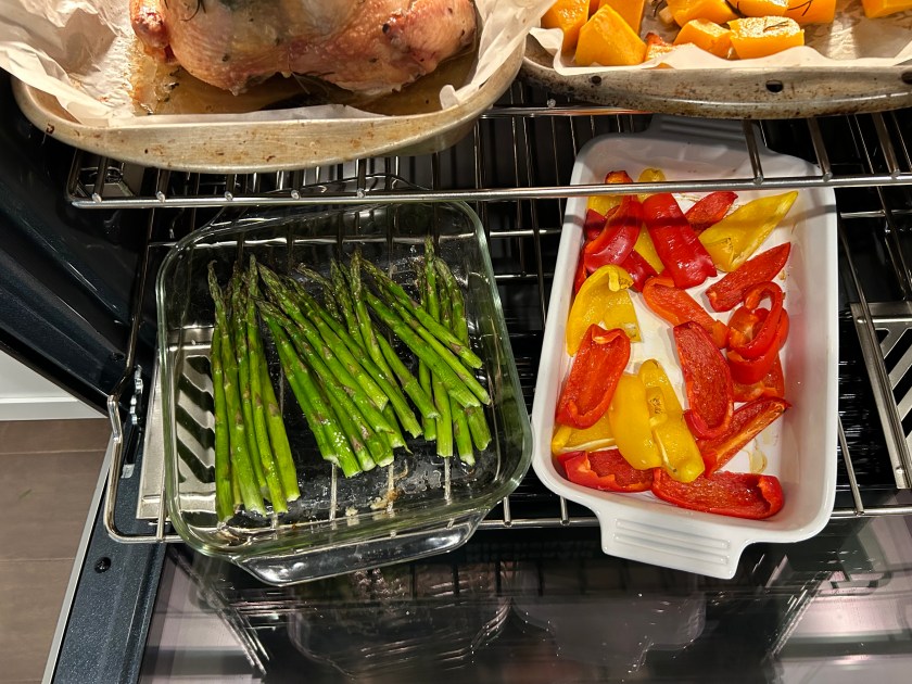 I made oven roasted chicken, cauliflower and carrot, red peppers, and asparagus–paired with leftover cold green beans with some sweet onion and dressed with dill and good olive oil.