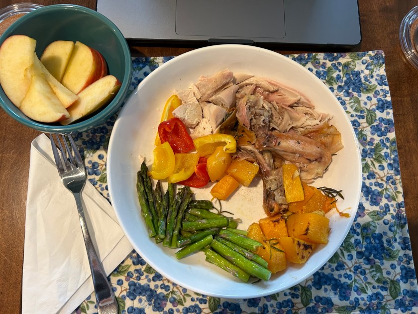 Here’s a hamburger air fryer roasted (with decadent Annie’s organic tomato ketchup), roasted spaghetti squashed dressed with butter, roasted red peppers (did you know they have A LOT of vitamin C?), and frozen broccoli crowns cooked in the microwave in their own bag.