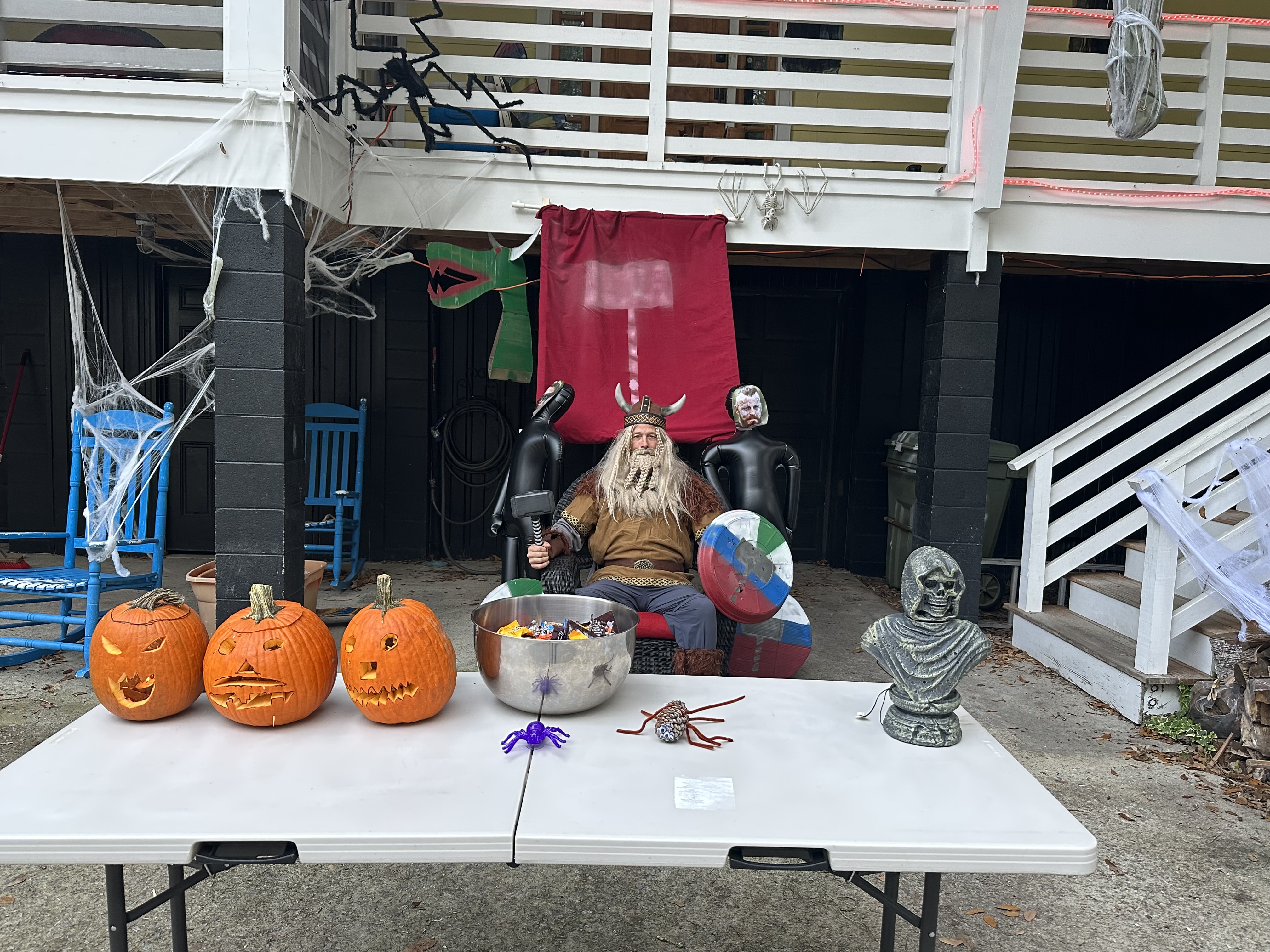 Halloween costumes are clearly a big thing–for children and adults. Over on the Isle of Palms, son Bryan made full use of his viking regalia used in the golf cart parade. He holds the fort while Corinne takes their three girls around the neighborhood.