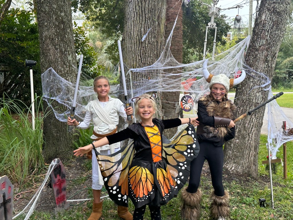 Halloween costumes are clearly a big thing–for children and adults. Over on the Isle of Palms, son Bryan made full use of his viking regalia used in the golf cart parade. He holds the fort while Corinne takes their three girls around the neighborhood.