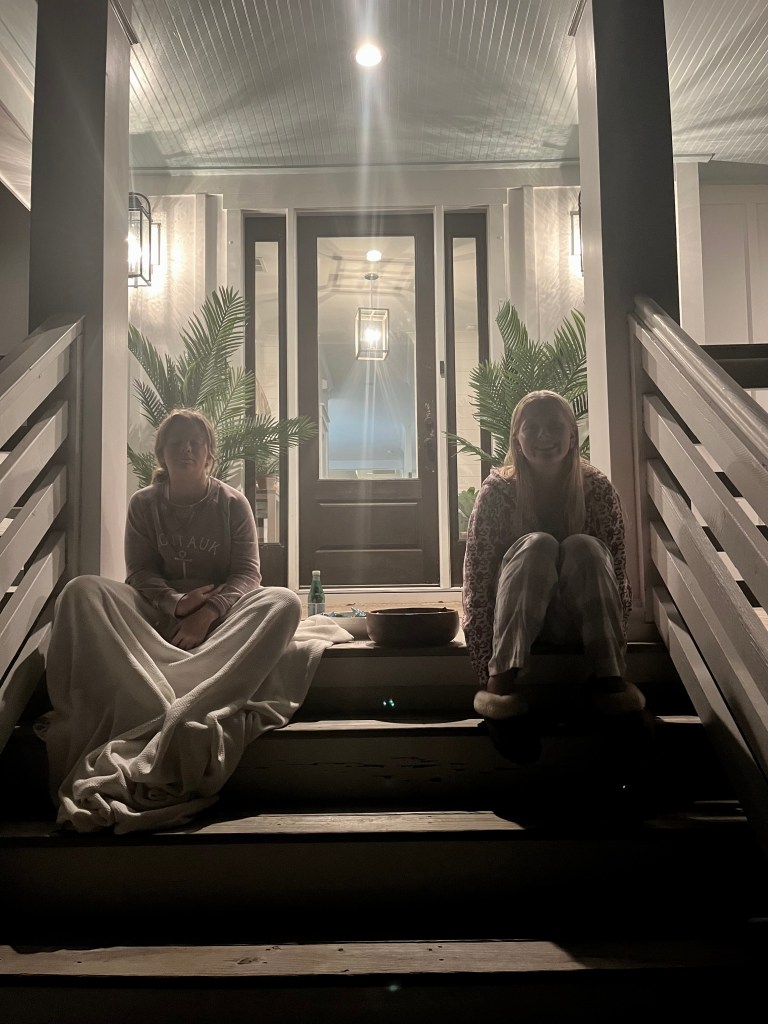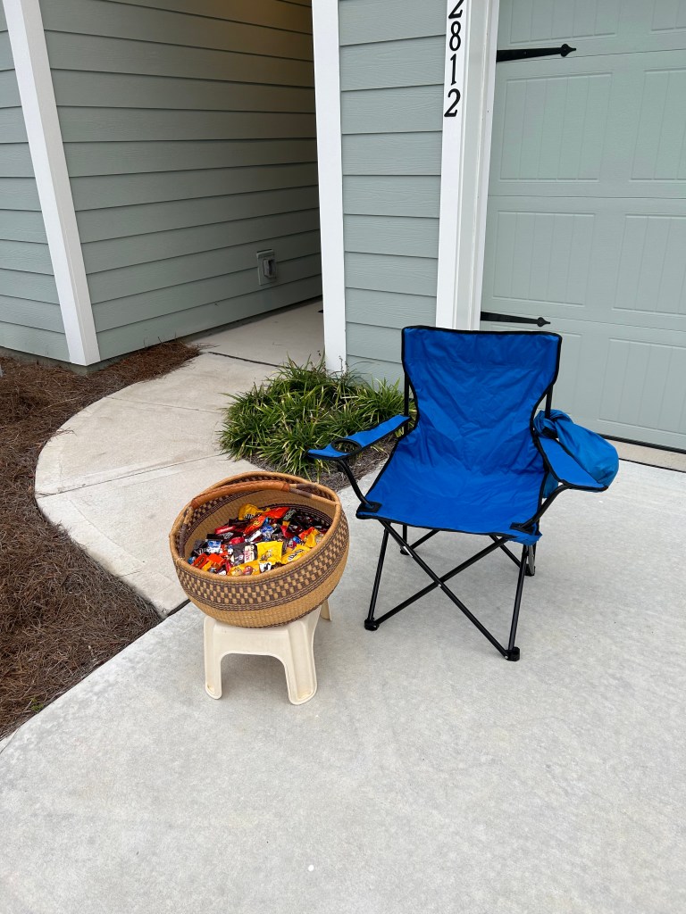 I started out sitting near the front door, but quickly moved down to the driveway edge—as did my front street neighbors. We talked and visited while children came and went—mostly little ones, accompanied by parents.