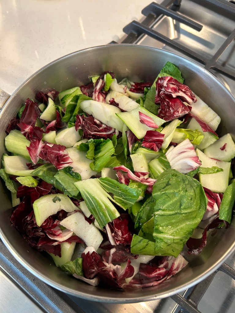 On one recent day, I pan sautéed baby bok choy and added some radicchio leaves. I love sautéing the baby bok choy and just cook it until it is barely fork tender; otherwise it gets too limp.
