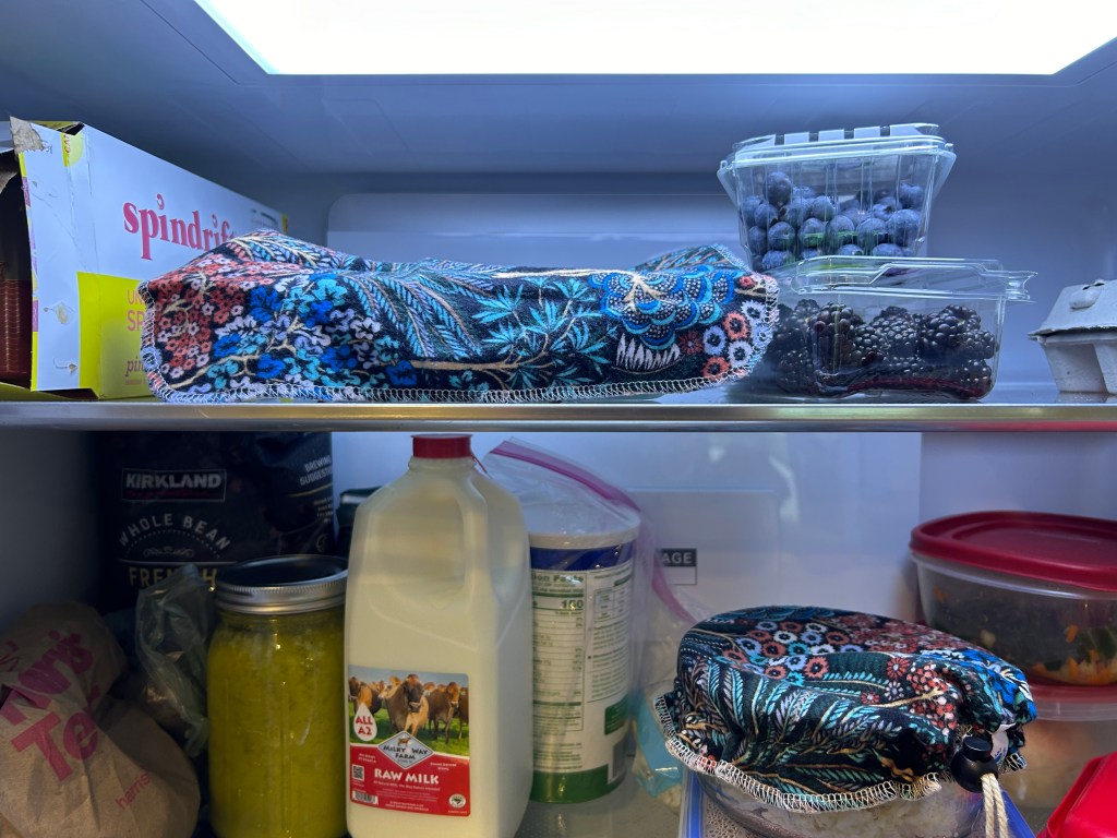 The berries come in little plastic containers–and the blueberries and blackberries do just fine stored in the refrigerator in those containers. But NOT the raspberries. I’ve discovered if I put them on a bed of paper towels and just loosely cover them with one of my “One World, Zero Waste” fabric sheets–NOT more plastic–they last without melting or molding for many days. In the plastic container, the raspberries start to go bad in one day or less.