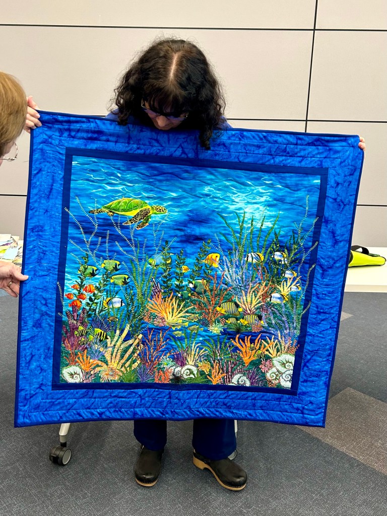 As usual, the Show and Tell part of the meeting was awesome. There is so much talent in this group, but there are beginning quilters too, and I do so like a mixture of quilter types in a quilt group. Thus, each month many types of quilts are shown, including modern, traditional, art, and…more. The program for this month discussed and demonstrated how to make wave and scallop borders.