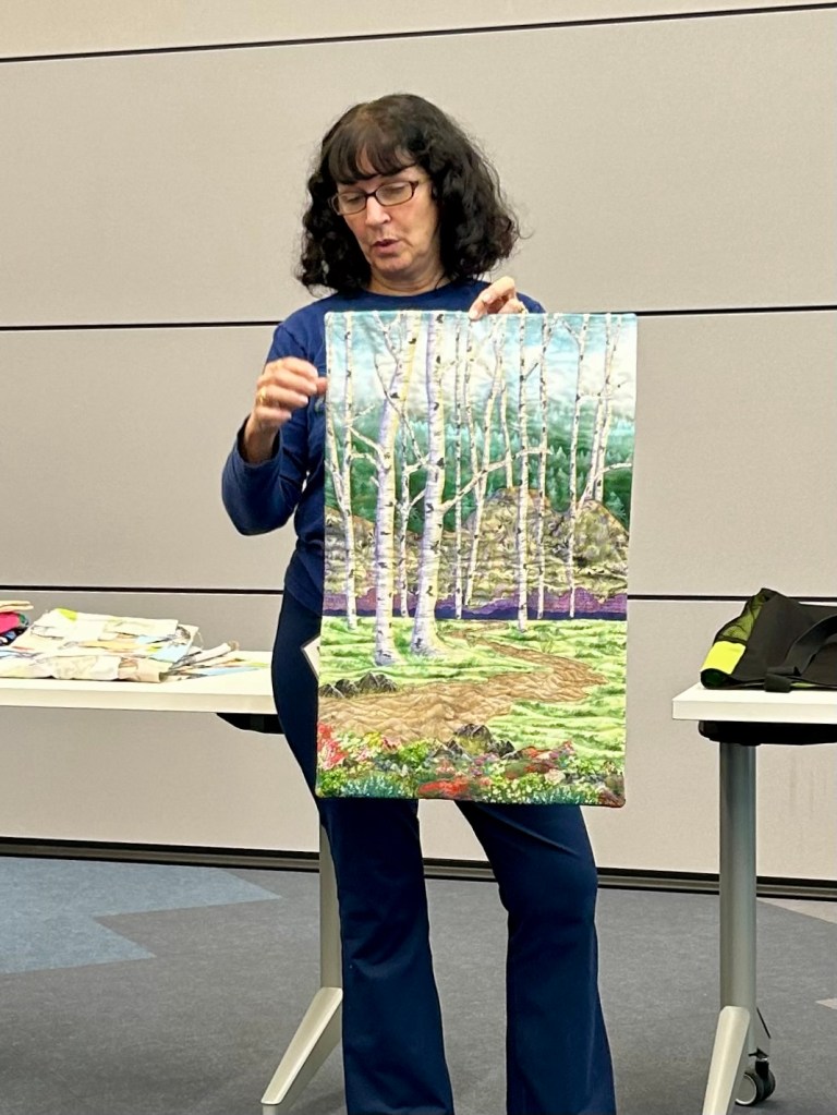 Marva also showed this smaller quilt of white birches–and again, the way she captured light just made her quilt glow. Her quilt effects are made totally with appliqué.