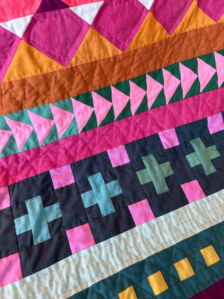 I layered her and started the hand quilting back in June, and I’ve been faithful to spending some time with Traverse every night. I used 12-wt cotton threads (Sulky, Wonderfil, Aurafil) that matched the fabrics as close as I could–and had fun playing with how to quilt around or over or through the patterns. And, I used a size 6 Tulip embroidery needle. I could have used a 7, which would be a bit smaller and thinner, but I was comfortable with the 6.