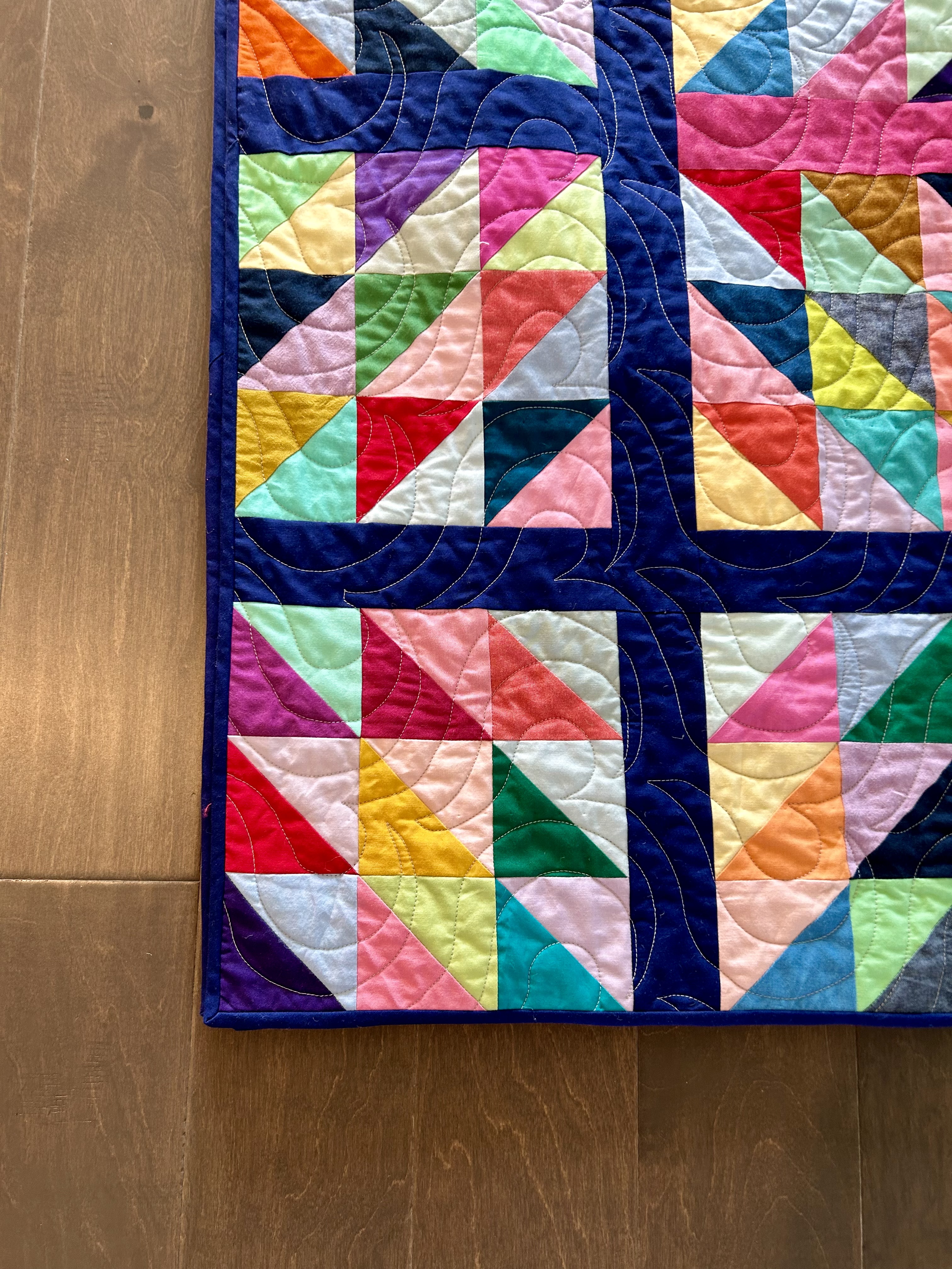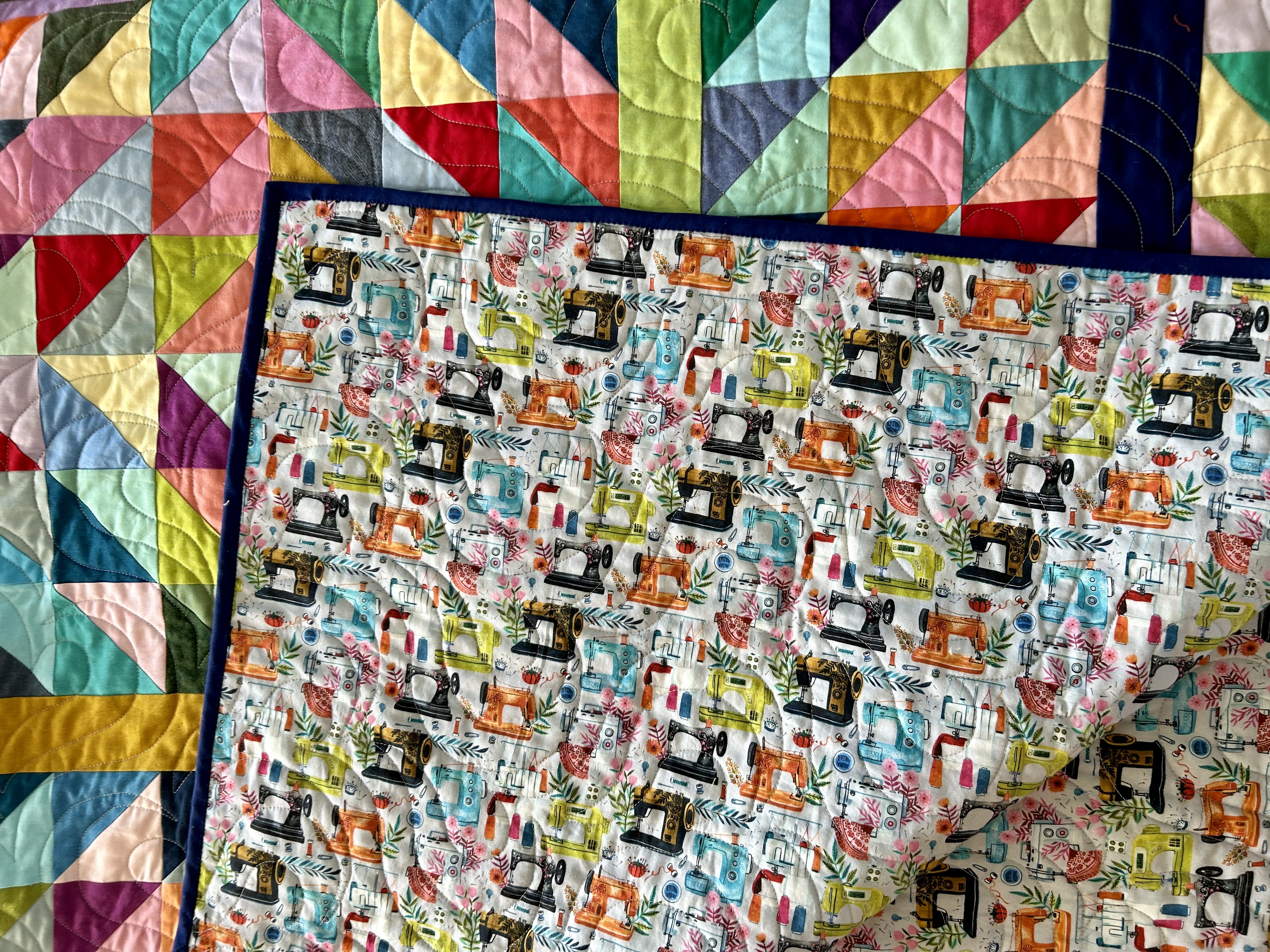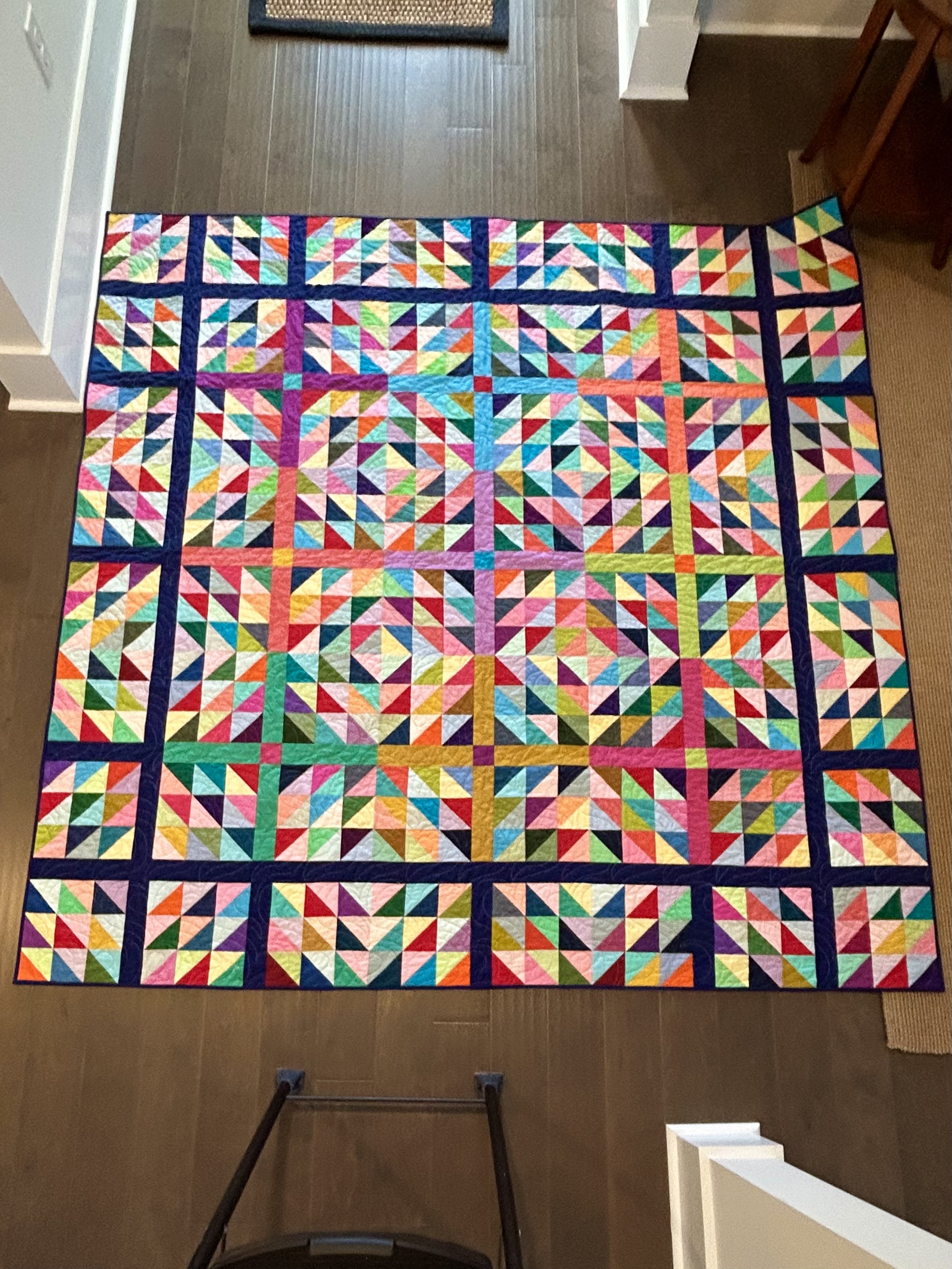 Outstanding. I love the sashing and following it to the color change, and thinking about how it defines the block, but then that secondary pattern is drawn to my eye. I also love the way you used that purple/blue as a way to create a border on the quilt. Beautiful from every angle. That backing fabric is wonderful too.