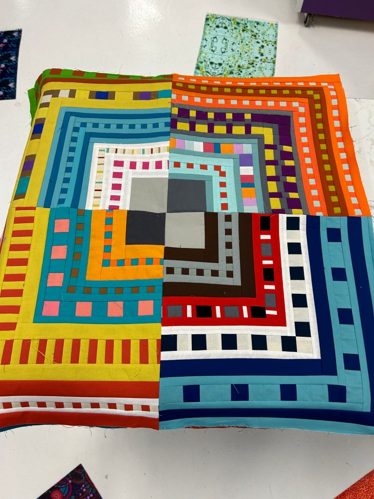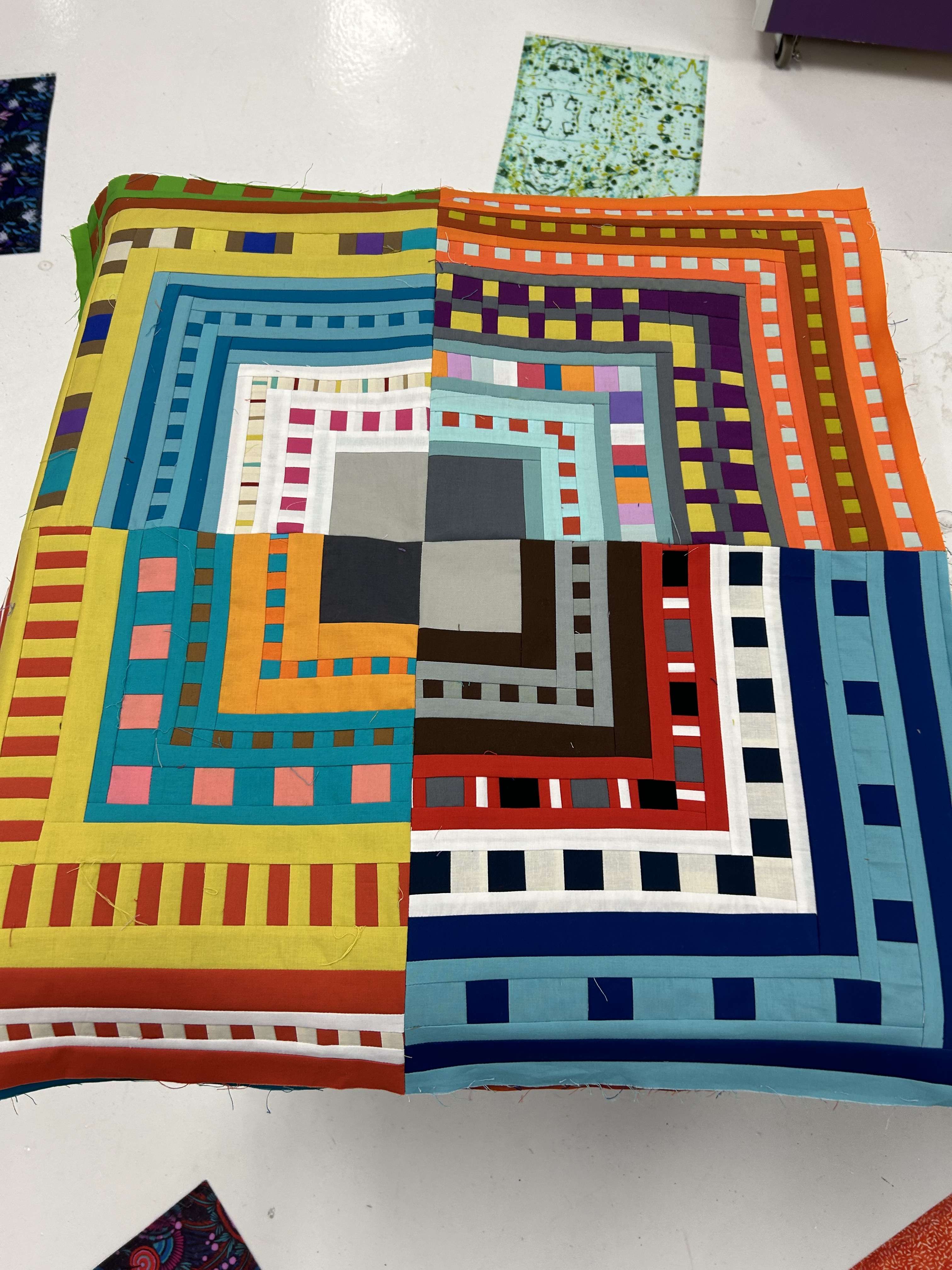 Cathy Beemer started teaching us how to make an incredible scrappy block that she is also making. Cathy is a MASTER piecer and quilter. This block is 30 inches square, and she will be making a quilt that is 90 by 90 with her scrappy blocks. Each block quarter piece will be scrappy and different.