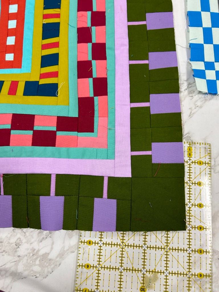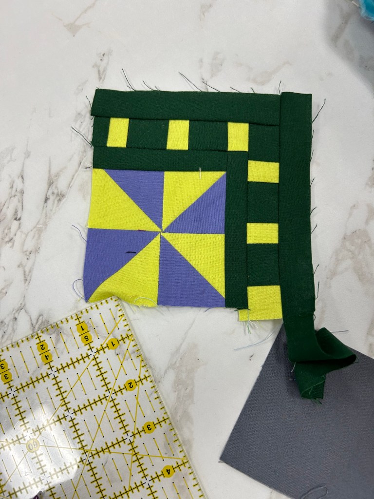 I’ve already color sorted my solid fabric strips and have cut out pieces for my first center. I’m going for the pinwheel!
